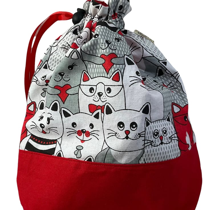 This is a two at a time sock knitting bag, but it also could be used for other things. It has the cutest cats in rows print cotton on a white background . The lining and outer accent are in a bright red cotton that coordinates nicely and gives a pop of colour.