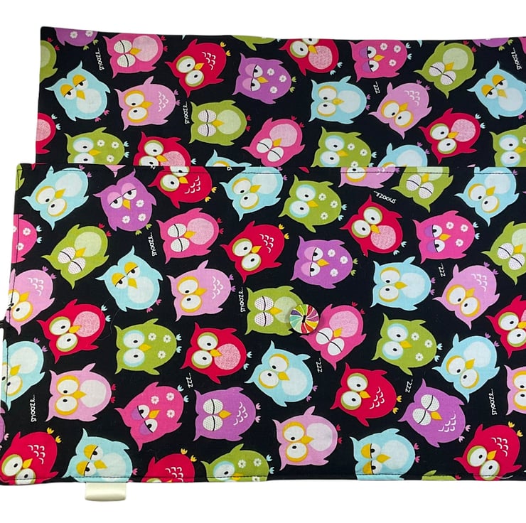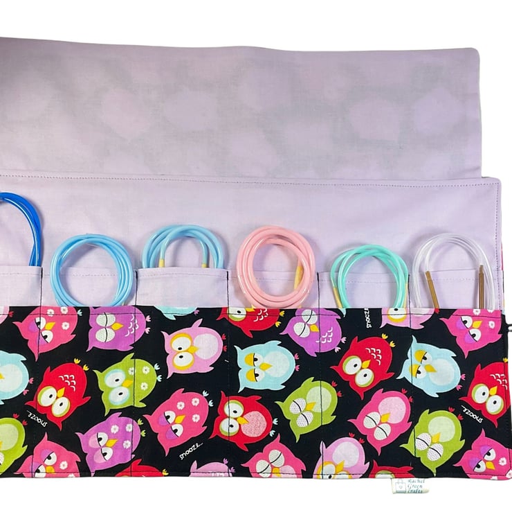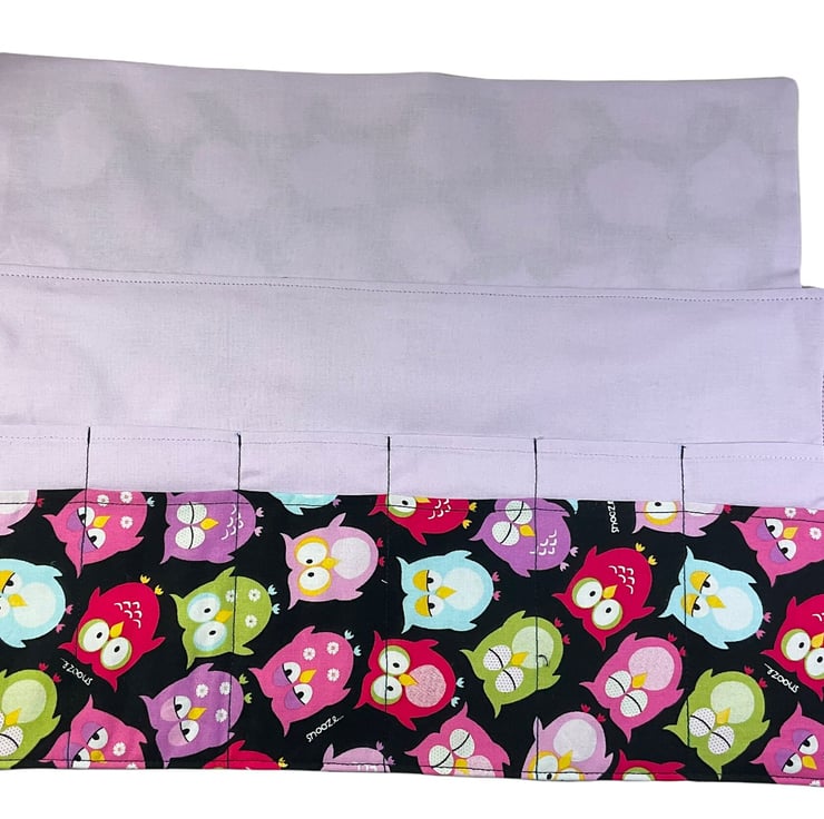 I have used a fun bright shades owl print cotton fabric In green, blue, purple and pink on a black base.This fabric is used for the outer, flap and lower pocket and a pastel lilac cotton fabric is used to line the case and the upper needle pocket. The case is interfaced for structure and strength and topstitched all around for neatness.
