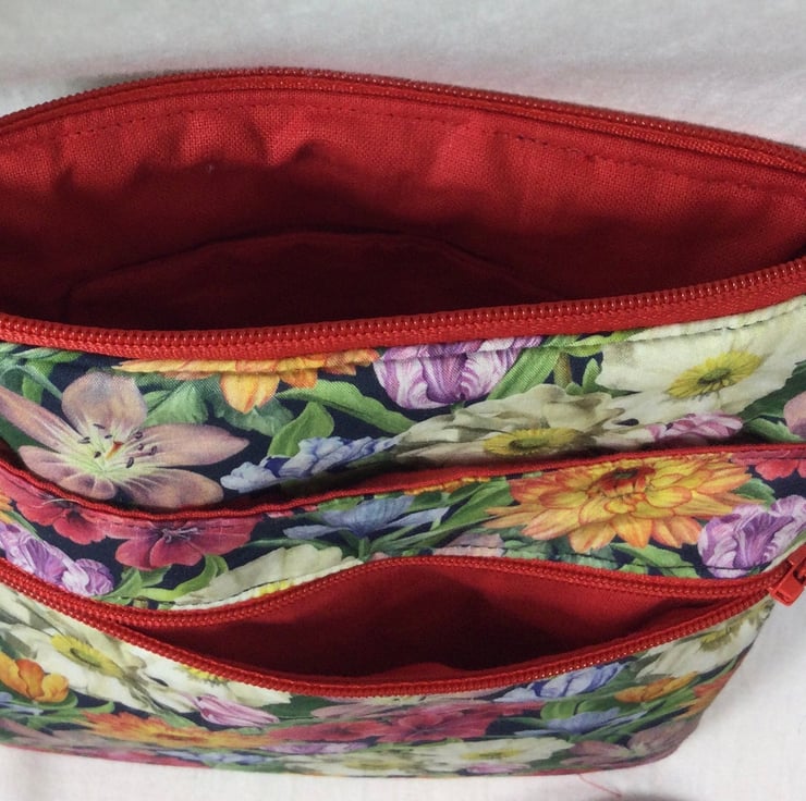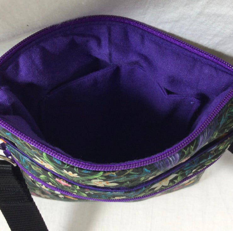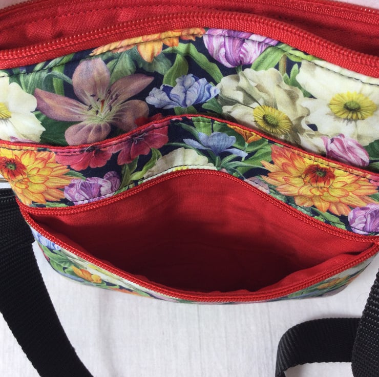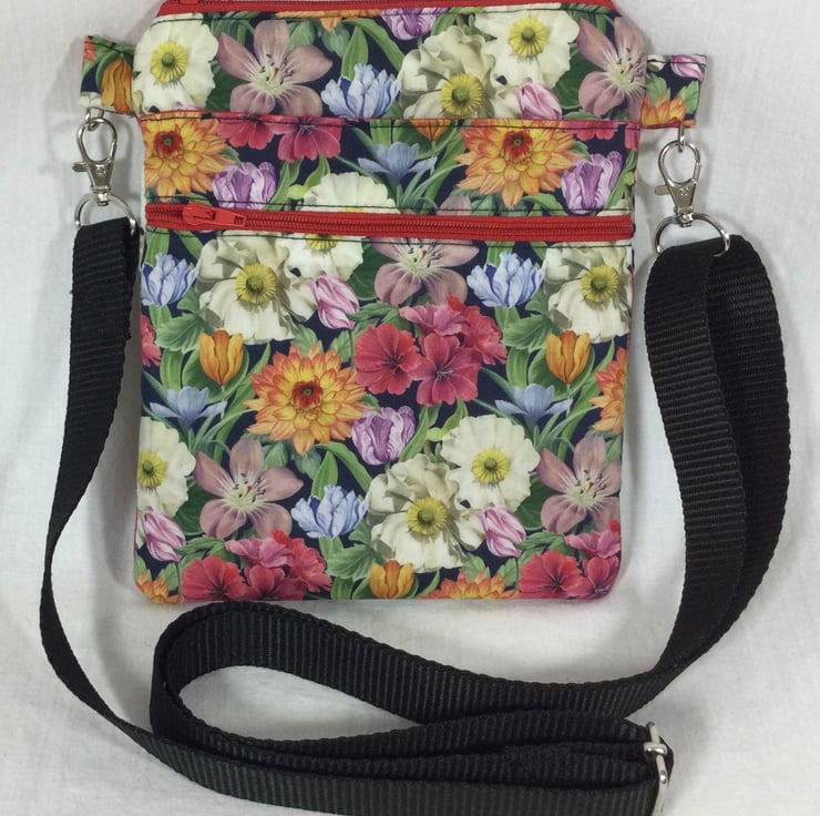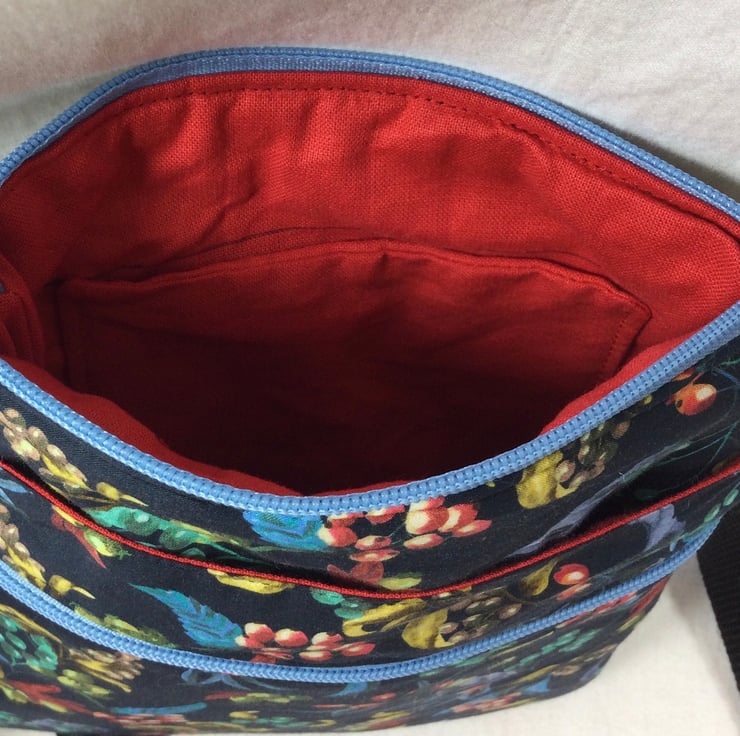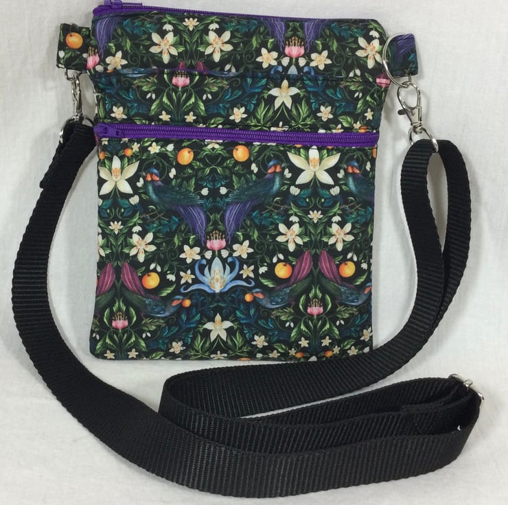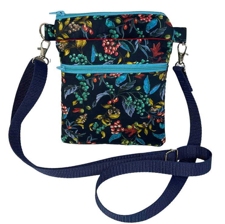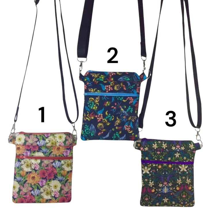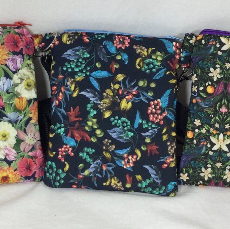A choice of 3 oh so pretty Liberty print small phone sized shoulder bag. Made in Liberty's luxury Tana Lawn with its almost silk like texture. This handy bag is slim so sits close to your body, and will hold the basics when you want to grab a small bag for a trip out. I have managed to fit a purse, my phone (iPhone XS in a case) and a diary. There s melody blooms with its gorgeous realistic flower heads on a navy base which is lined in red cotton. The lovely forbidden fruit with its ornate birds and oranges on a black base, this is lined in deep purple cotton, finally we have the pretty bitter sweet with its foliage and berries, on a navy base, this is lined in bright red. inside is a phone pocket that can hold my iphone 6 in its case. There are also another 2 pockets externally, one a full width slip and another zipped which is also full width. The strong nylon heavyweight webbing strap is in black on forbidden fruit and navy on the other 2 and is fully detachable, it clips on with 2 swivel lanyard clips. The strap itself is approx 133cm (52.5") in length, long enough to go across your body and is fully adjustable. Each bag closes with a toning zip. The bag is fully wadded and interfaced for structure. contents shown for display and not included in sale.