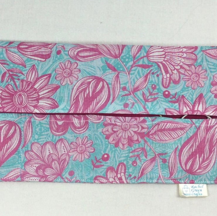 I have used a very pretty floral fabric in shades of pink and turquoise for the outer, flap and lower pocket and a cerise pink cotton fabric to line the case and the upper needle pocket. The case is interfaced for structure and strength and topstitched all around for neatness.