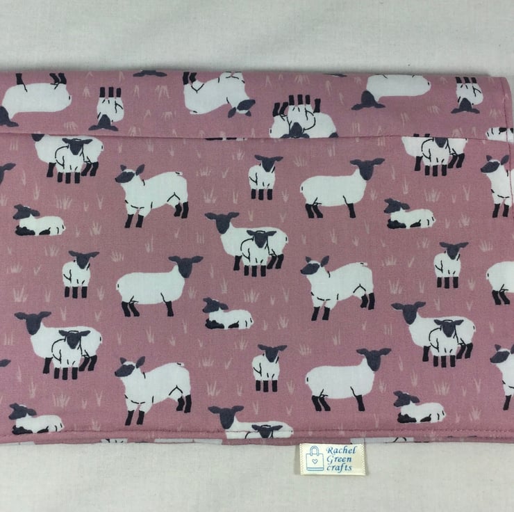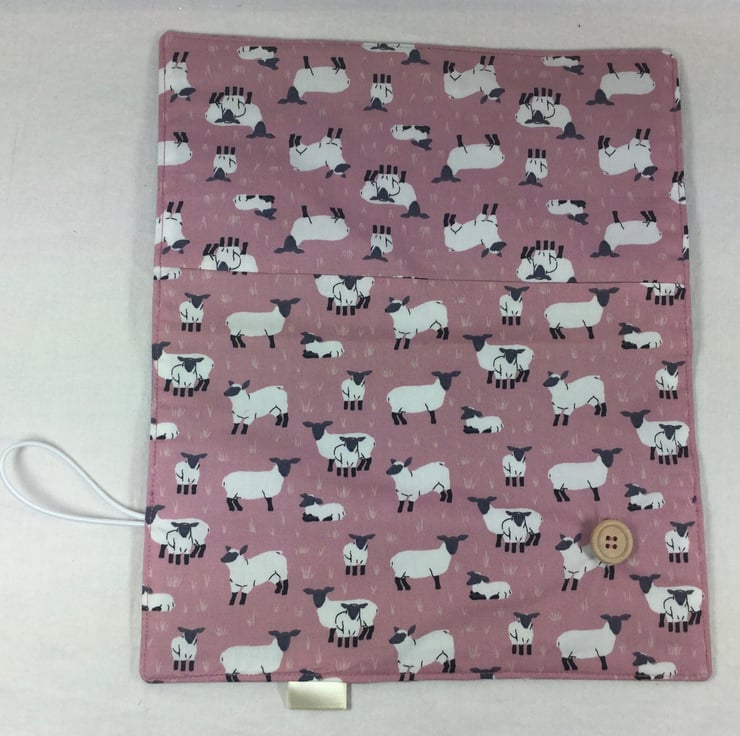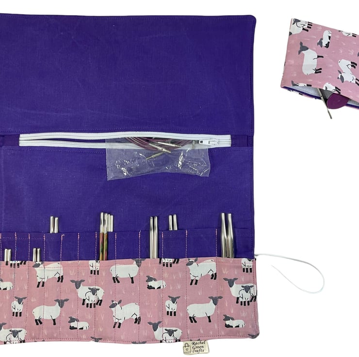 The case is made in a cute White sheep cotton fabric on a dusky pink background.I have fully lined the case in a deep lavender cotton. The flap to cover the needles doubles up as a generously sized zip pocket that will easily hold several cables. This case even comes with its own hook and loop closing mini pouch to hold all those smaller items.