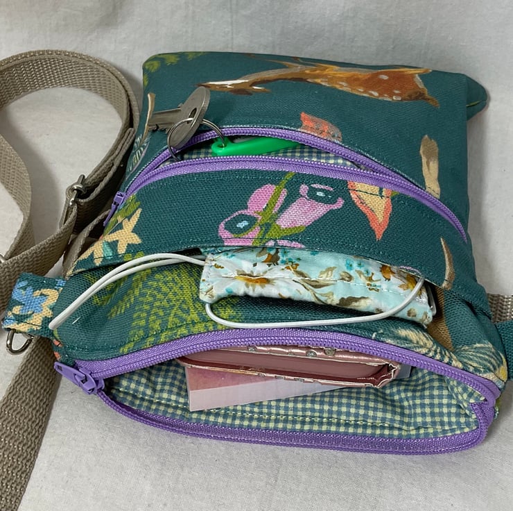 This handy bag is slim so sits close to your body, but is surprisingly roomy thanks to its multiple pockets. I ve shown an alternative print but identical set up bag with my phone in case, small note pad, mask and my door key. It is fully lined in white with orange spots on the small orange fox, deep turquoise on woodland fox and burnt orange dogtooth check on white on fox with fern . inside is a phone pocket that is large enough to hold my iphone 6 in its case There are also another 2 pockets externally, one a full width slip and another zipped which is also full width.