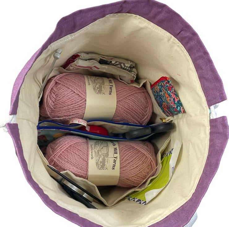 This is a good sized bag, I have demonstrated it filled (contents not included in sale.) inside are 400g of pure wool yarn along with all the tools you could possibly need! There is still plenty of space for your work in progress above this.