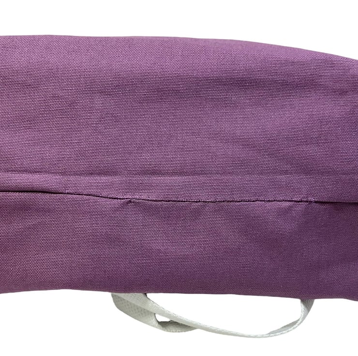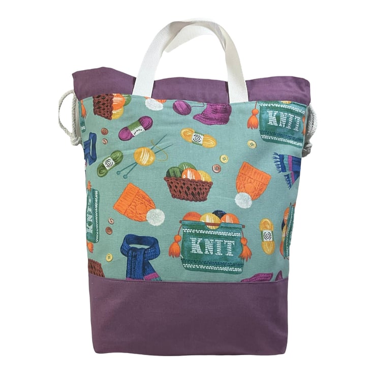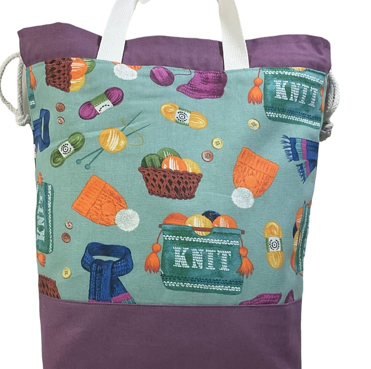 I am fussy about the bags I make and prefer them made in heavy weight fabrics for form and longevity. This bag is just that. It has a cute knitting themed print cotton on a smoky turquoise background and I have paired it with a deep lilac for the accents. The lining and slip pockets are mid weight natural cotton. The divider inside the bag is a fixed zip pouch that has the exterior fabric and the lining as bag lining. The whole of the bag is interfaced and boxed so it stands up.