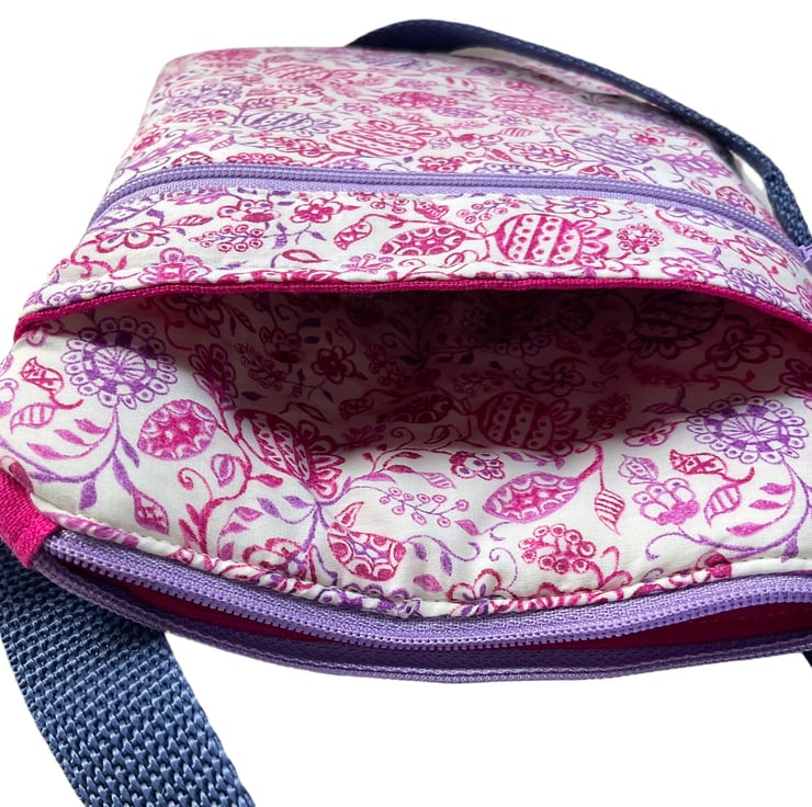 oh so pretty Liberty print small phone sized shoulder bag. A choice of 2, Made in Liberty's luxury Tana Lawn with its almost silk like texture, This handy bag is slim so sits close to your body, and will hold the basics when you want to grab a small bag for a trip out. I have managed to fit in an alternative print bag) a purse, my phone, diary, and a pen. Firstly we have Eri, a cerise pink and purple abstract floral print on an off white base, this is fully lined in cerise pink linen look cotton.The alternative is 'Birds of Paradise' a bird print including parrots and toucans again on an off white base, this is lined in pale blue cotton. inside is a phone pocket that can hold my iphone 6 in its case. There are also another 2 pockets externally, one a full width slip and another zipped which is also full width. The strong nylon heavyweight webbing strap is in navy on Eri and black on the birds, and is fully detachable. It clips on with 2 swivel lanyard clips. The strap itself is 131.5cm (45.5") in length, long enough to go across your body and is fully adjustable. The bag closes with a toning zip. The bag is fully wadded and interfaced for structure. contents and alternative print bag shown for display and not included in sale.