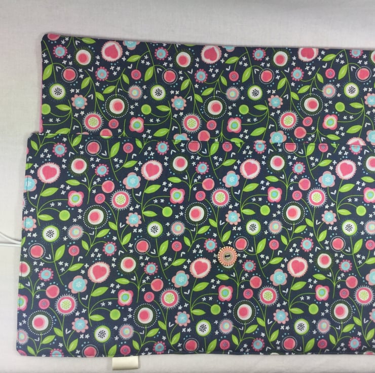 I have used an extremely pretty floral print cotton fabric in shades of pink and green on a denim blue background for the outer, outside of the flap and lower pocket and a pale pink cotton fabric to line the case, the Inside of the flap and the upper needle pocket. The main fabric is a tasteful blend of flowers with stems and bees.