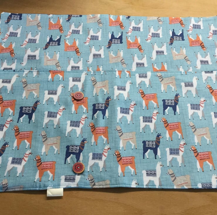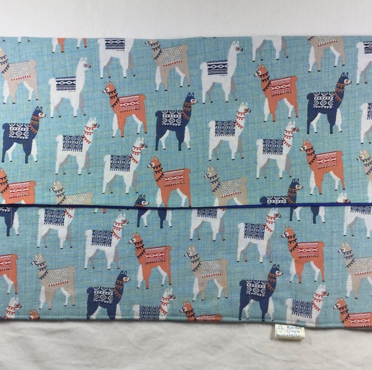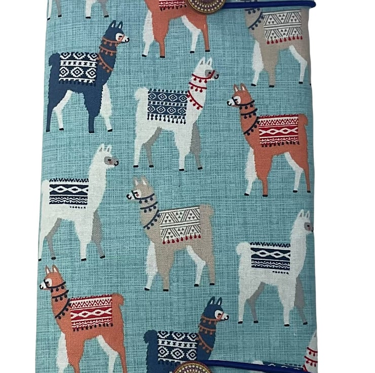 This case is made In lovely Llama print fabric on a mid turquoise background.