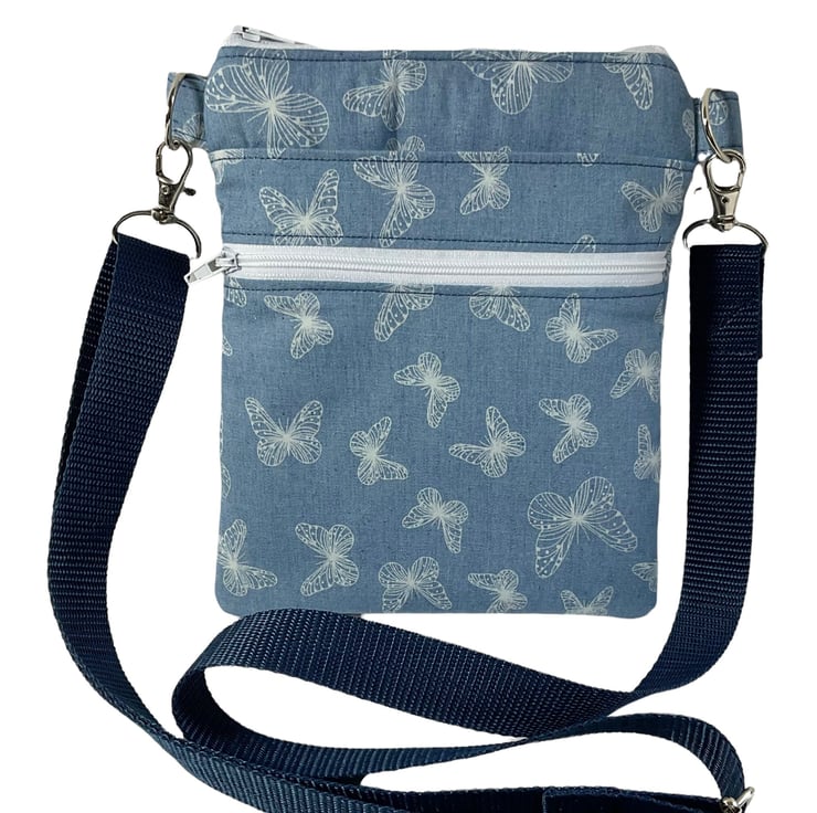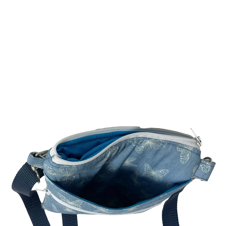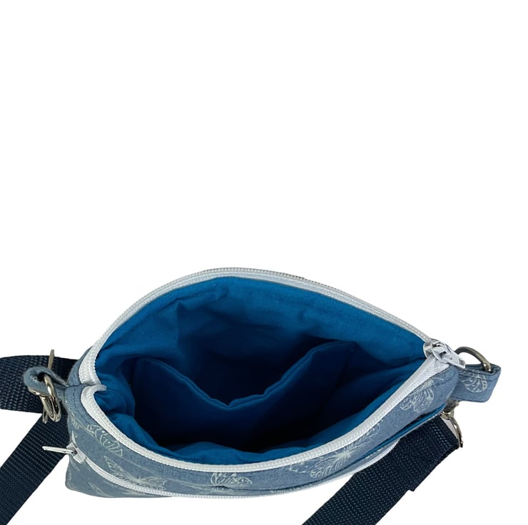 First we have the oh so pretty pink based small floral print on a denim blue base. This is lined in purple check on white cotton. Next is an attractive white line drawing butterflies on a slightly lighter blue base than the floral choice, this is lined in turquoise cotton. inside is a phone pocket that can hold my iphone 6 in its case. There are also another 2 pockets externally, one a full width slip and another zipped which is also full width. The strong nylon heavyweight webbing strap is in black and is fully detachable, it clips on with 2 swivel lanyard clips. The strap itself is approx 133cm (52.5") in length, long enough to go across your body and is fully adjustable. Each bag closes with a toning zip. The bag is fully wadded and interfaced for form and strength.
