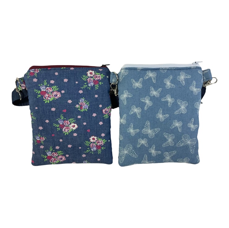 A choice of 2 fun and colourful print small phone sized shoulder bag made in a light weight denim . This handy bag is slim so sits close to your body, and will hold the basics when you want to grab a small bag for a trip out. I have managed to fit a purse, my phone (iPhone XS in a case) and a diary.