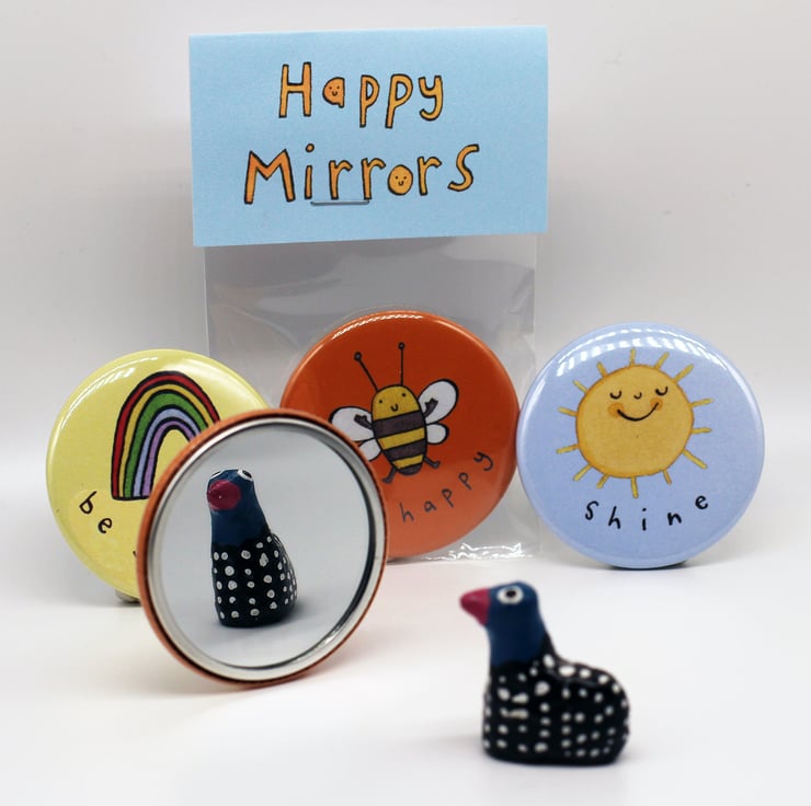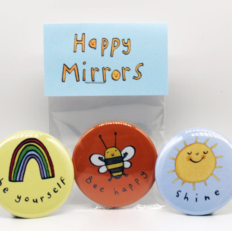 These Happy mirrors are pocket sized and full of positivity! Choose from 'Bee Happy', with a cute illustration of a bee character, 'Be Yourself' , with an illustration of a rainbow or 'shine' with an illustration of a smiling sun. Perfect for teens or anyone who needs a bit of happiness in their pocket!