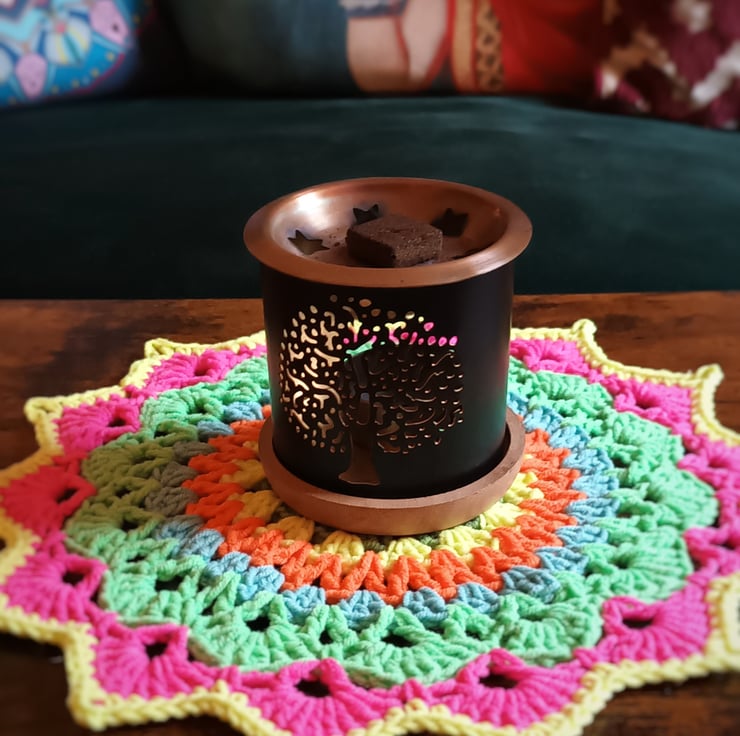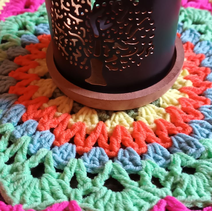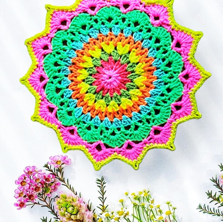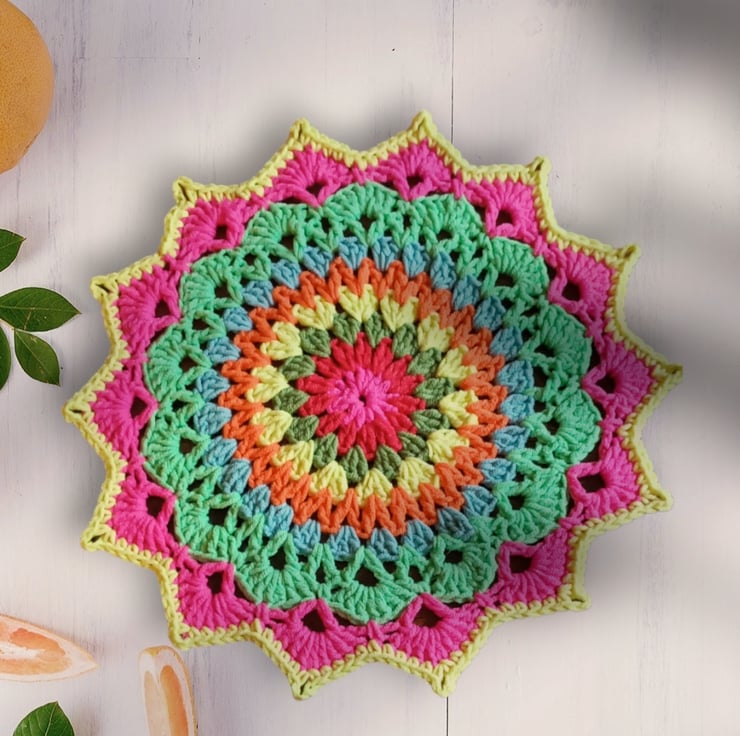 Ultra bright mandala table mat / doily. 24 cm diameter. Crocheted on the west coast of Scotland in a lovely soft cotton blend yarn.