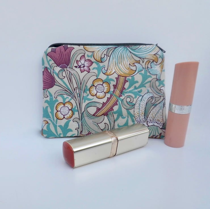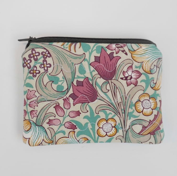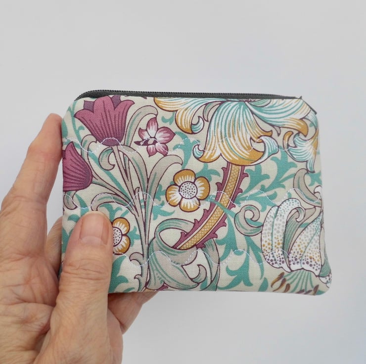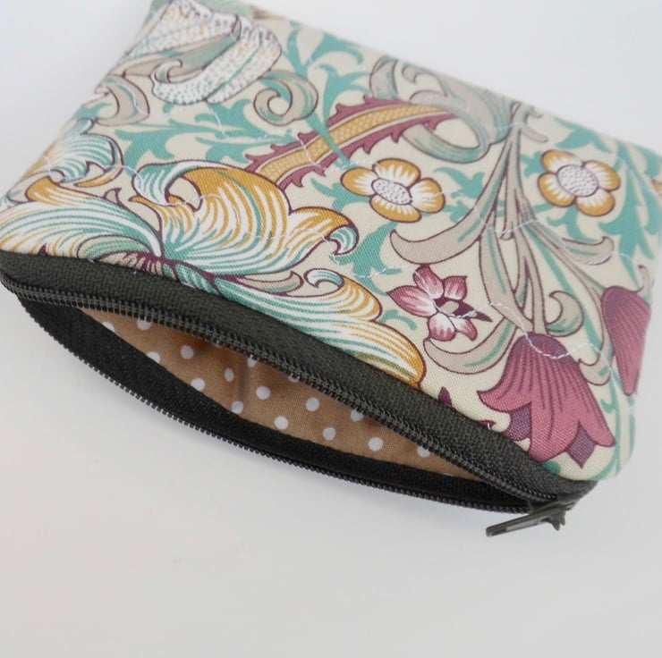 This zipped purse is made with a quality quilting cotton printed with William Morris' iconic Golden Lily design in dusk colour way. Lovely shades of plum and soft greens. I backed this fabric with fusible quilter's wadding and then machine stitched across each side with three rows of wave stitch to achieve a lightly quilted effect. It is lined with a coffee colour spotted quilting cotton.