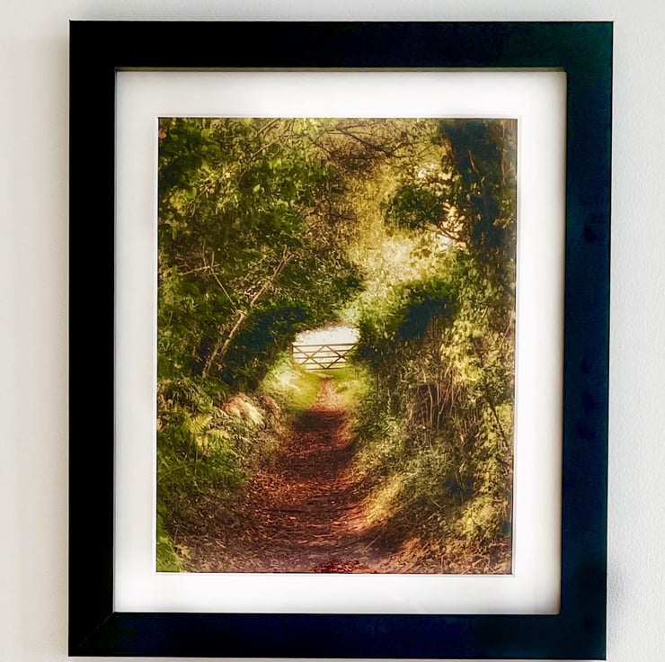 The way the autumn light shines through the trees to illuminate the gate at the end of the path seemed magical to me and the green and golden shades will look great on any wall!