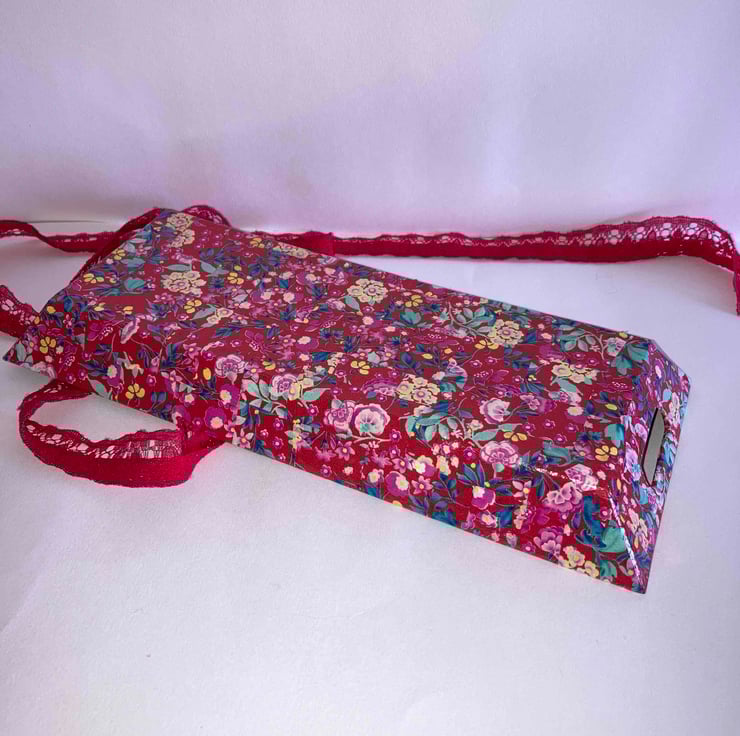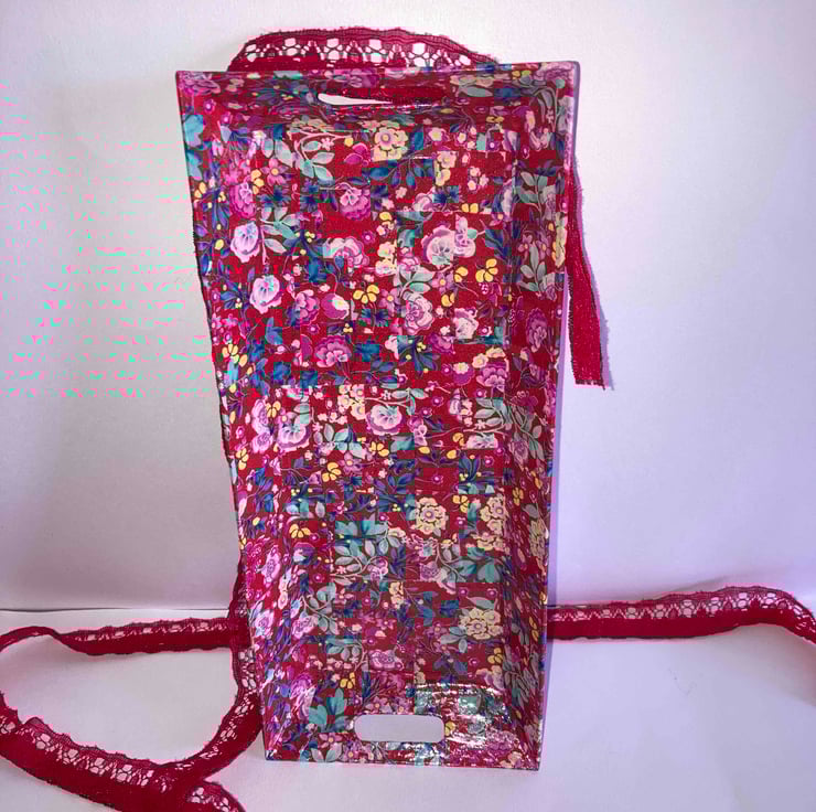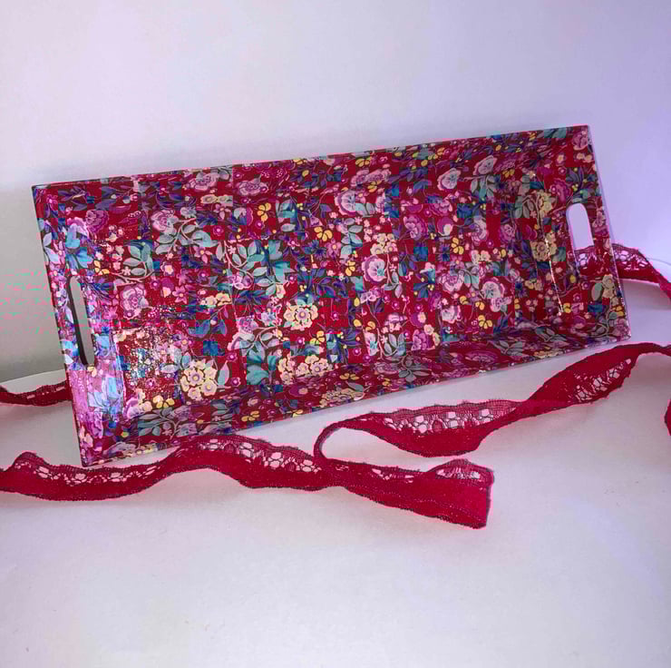 This paper mache tray has been covered in s bright red floral pattern decopatch papers which are cut for that patch design.