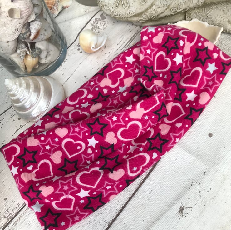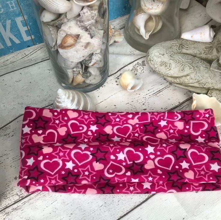 A colourful pink hair band. A great everyday hair accessory. Simply wear the headband over or behind your ears. Double sided.