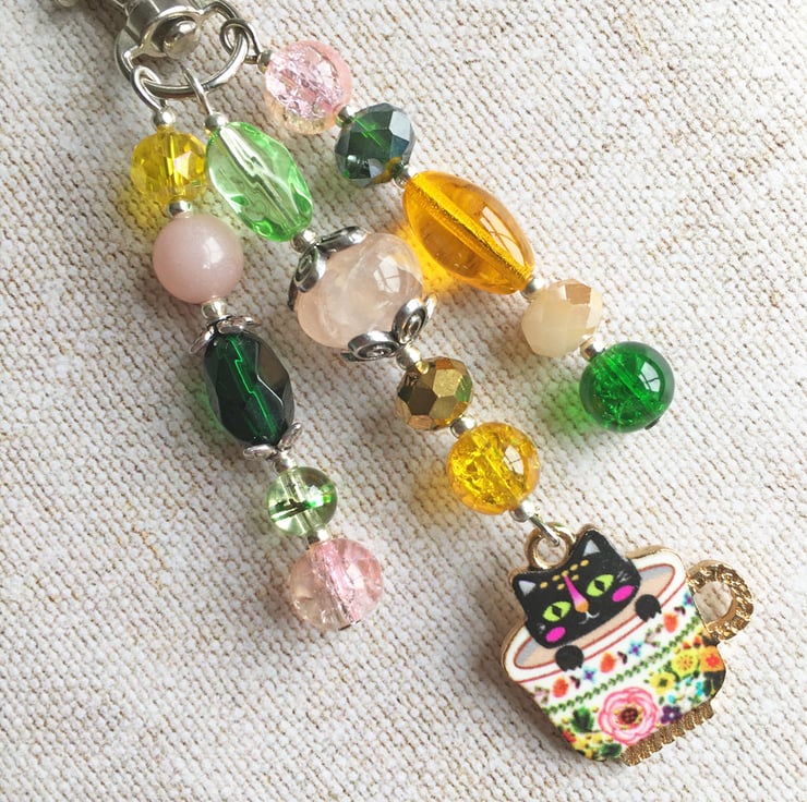 I've used a cute, gold-plated enamel charm and an assortment of glass and semi-precious beads including Rose Quartz, drawbench and crackle glass.