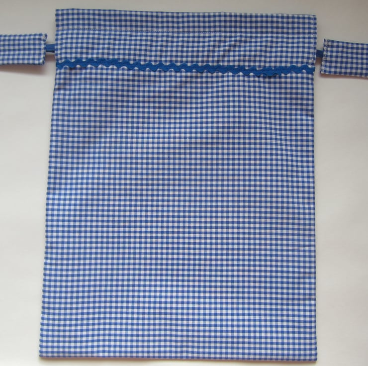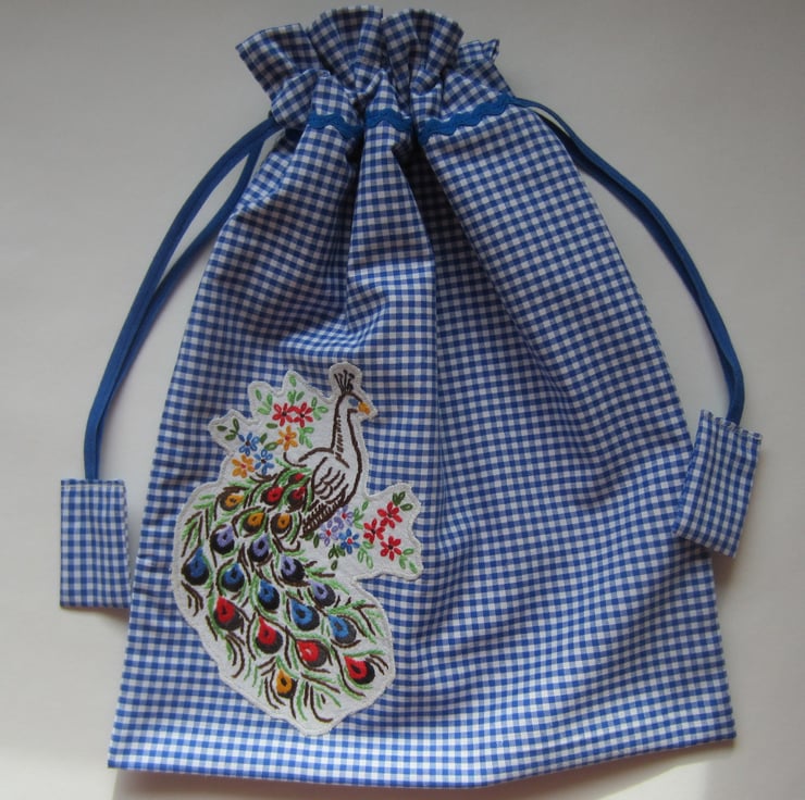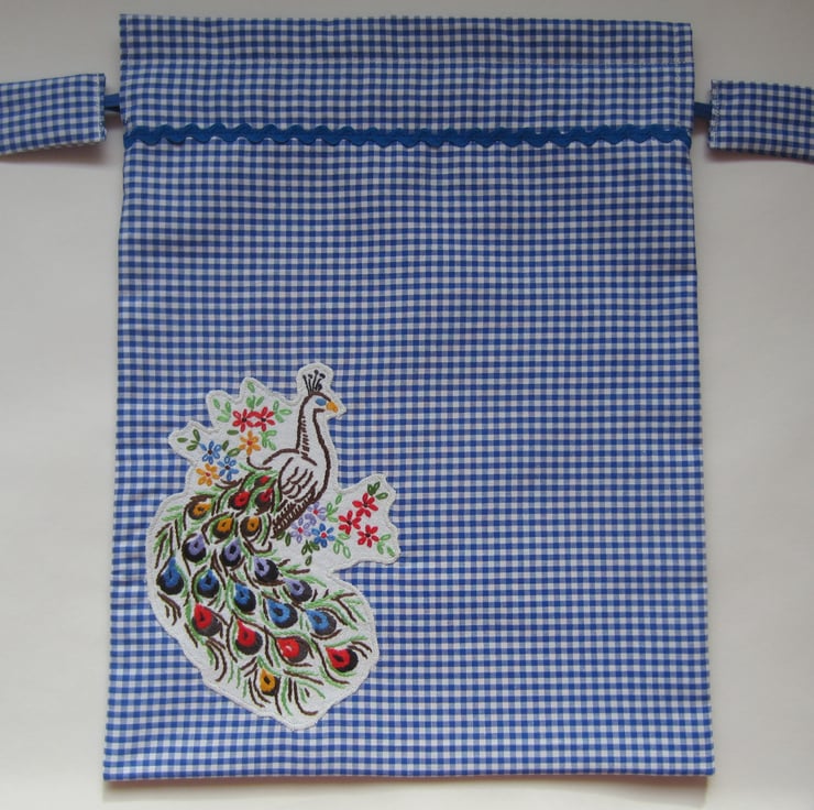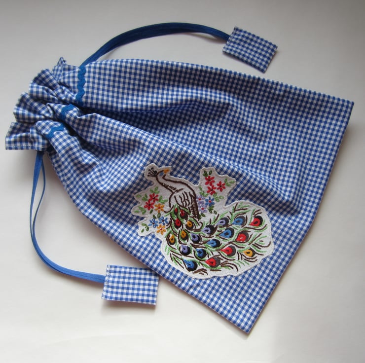 Blue gingham drawstring bag with added vintage hand embroidered peacock and blue ric rac braid. It is lined with a floral fabric. Closes with blue tape and tabs.