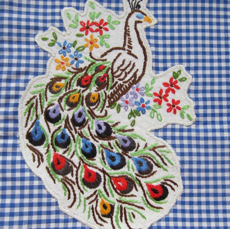 SALE Blue Gingham Vintage Embroidered Peacock Drawstring Bag