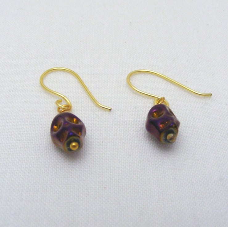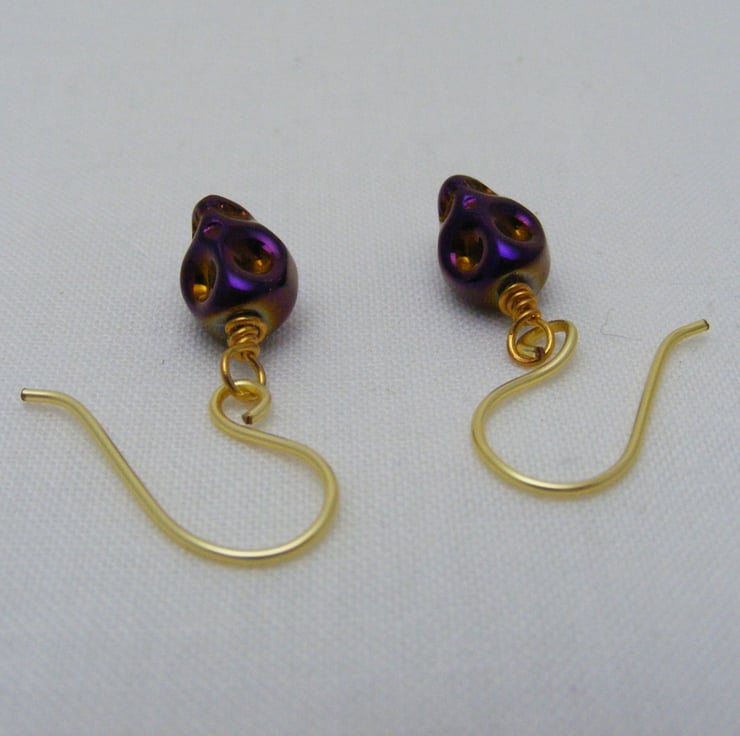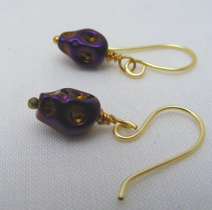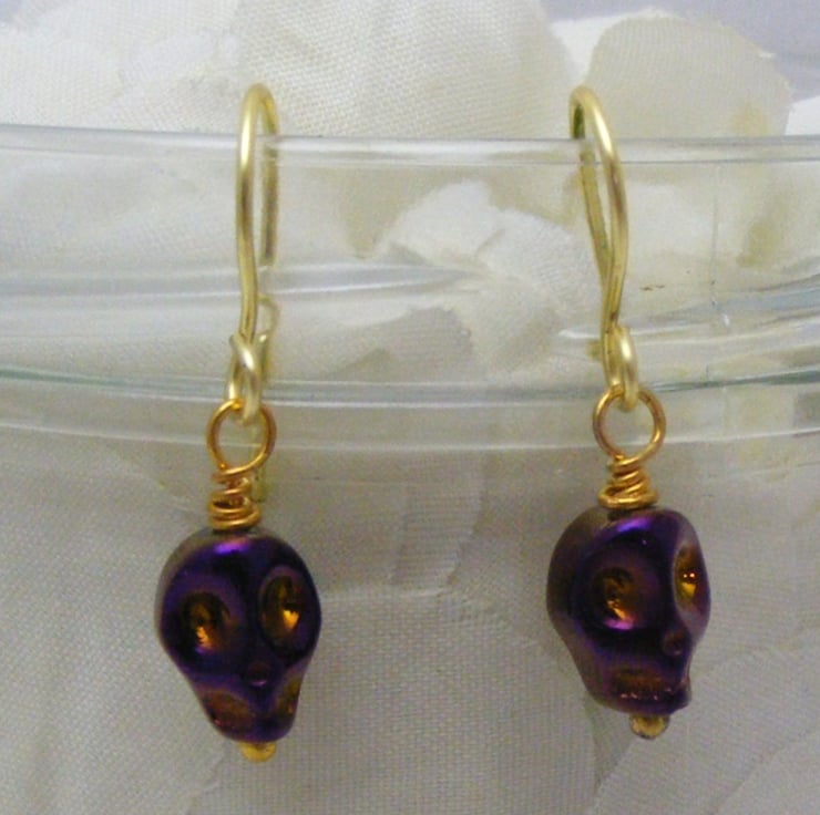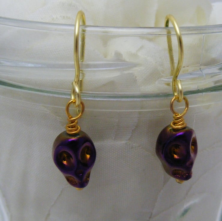 Earrings are handmade with 10x7mm purple metallic glass skull beads, gold plated headpins and gold plated hypo allergenic wire to make the ear wires.