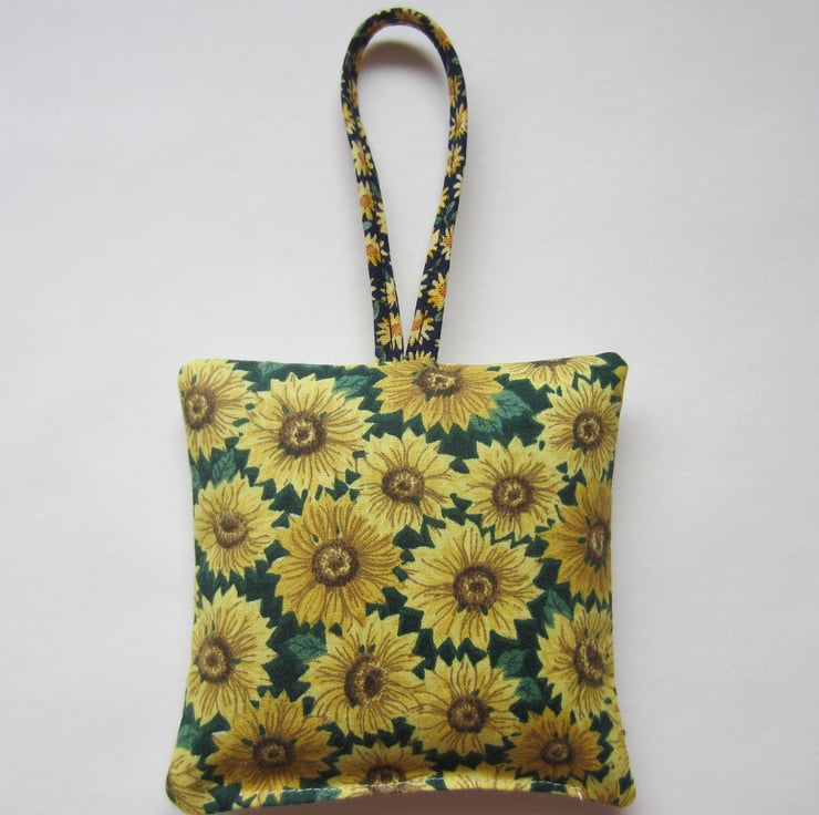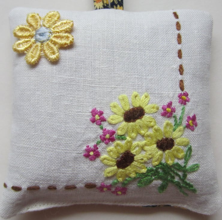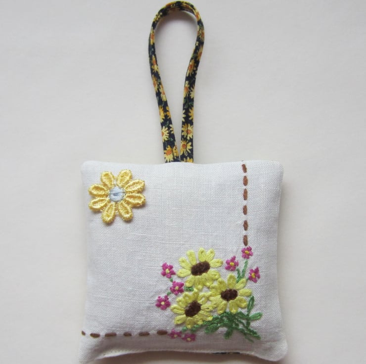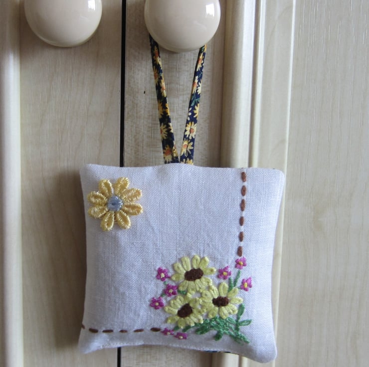 Hanging lavender sachet with a vintage embroidered flower and leaf design front in yellow, purple, brown and green colours with an added yellow flower embellishment. The back and hanging loop are in coordinating yellow flower fabrics.