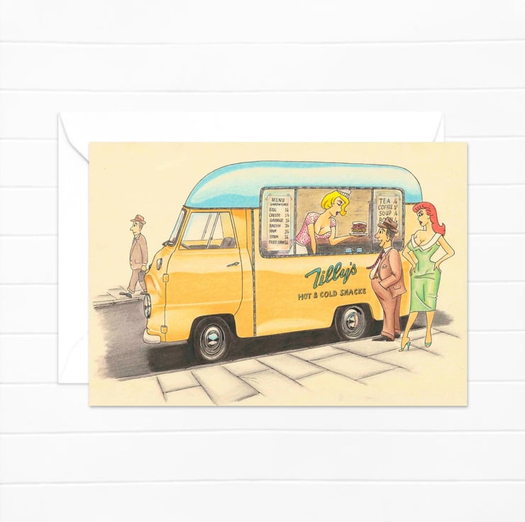 An original art greeting card featuring a hand-drawn pencil illustration of an old time food van and it's assorted queue of customers. Artwork with a retro vibe, inspired by a love of mid century art and culture.
