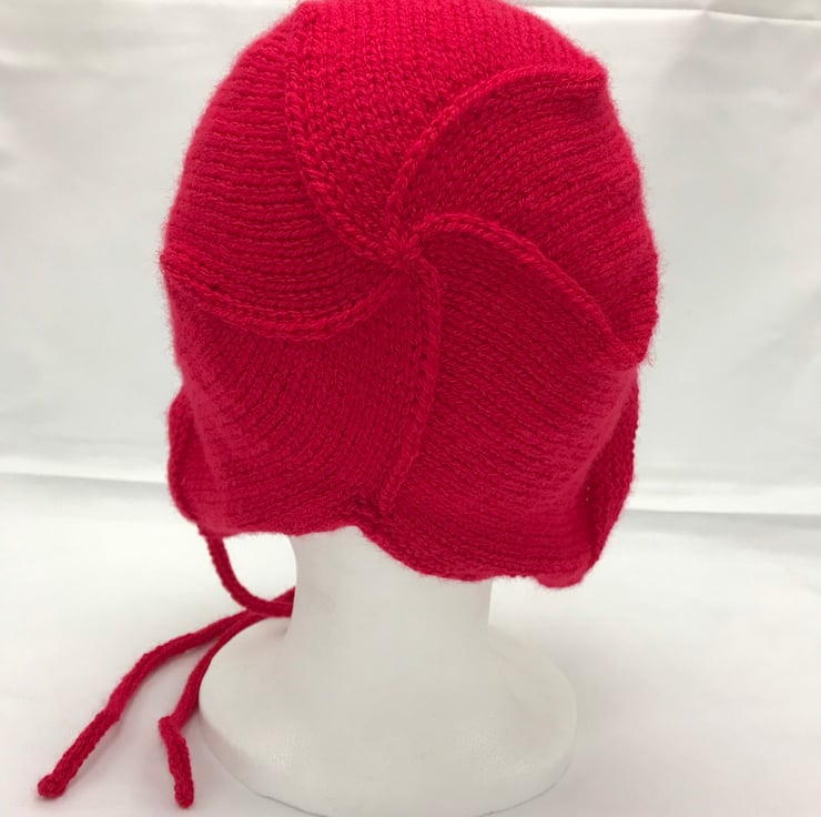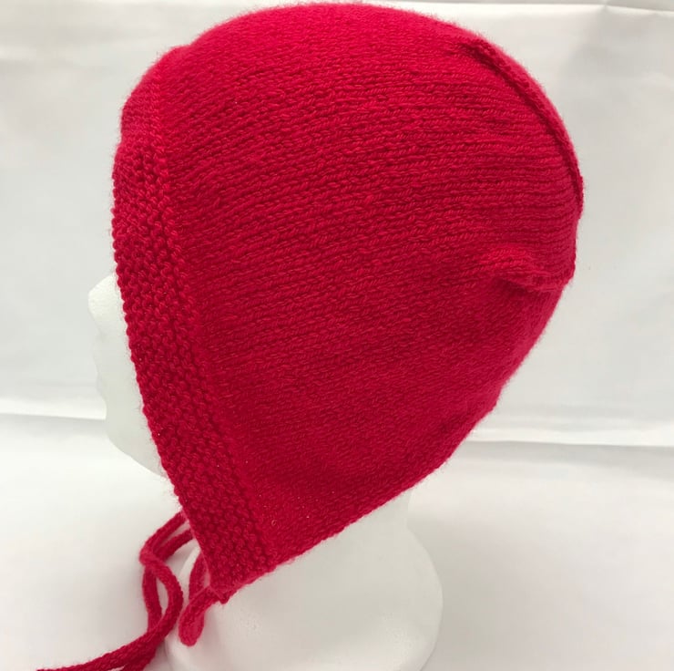 This bonnet hat is hand knitted using acrylic yarn. This red coloured hat has a ridge patterened edge which goes round the face with the main body of the bonnet being plain. This gives the hat a lovely vintage style look with it's simple clean lines. The bonnet is fastened with 2 hand knitted ties to ensure a snug fit or can be left untied.