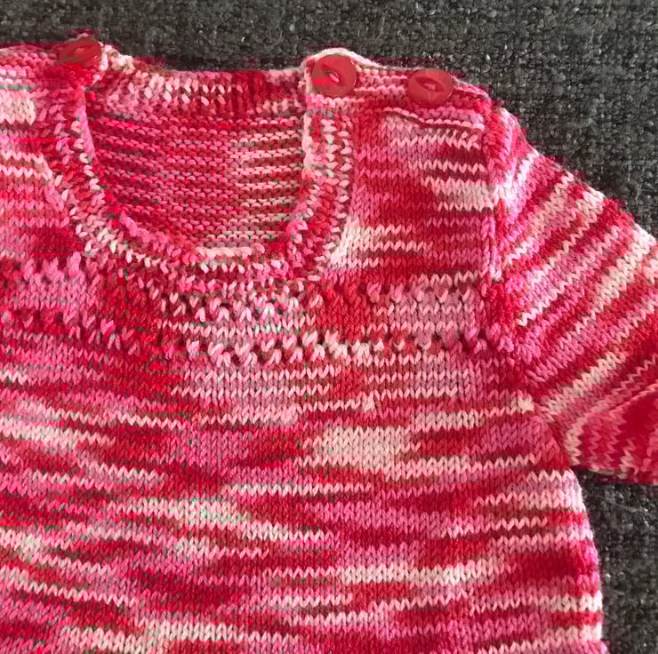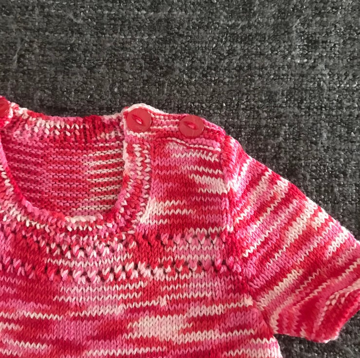 The beautiful multi coloured short sleeved crew neck dress will fit approximately size 6-9 months old, with an actual chest size 50 cm (20 inches). The dress tunic is fastened at both shoulders with 2 pink buttons for ease of dressing and there is a lace detail on the hem of the dress and at the chest.