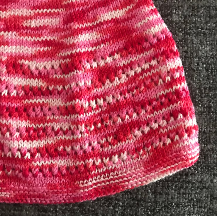 This brightly red, pink and white coloured jumper dress has been hand knitted using bamboo yarn which gives the dress a beautiful drape, it also means that is extremely soft to the touch. It would look great over tights, leggings or even a pair of trousers.