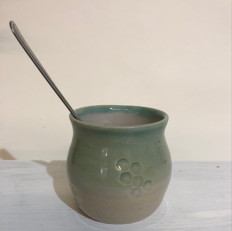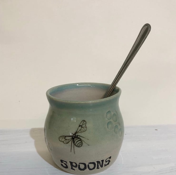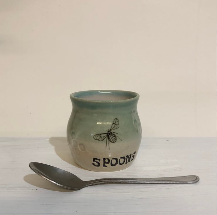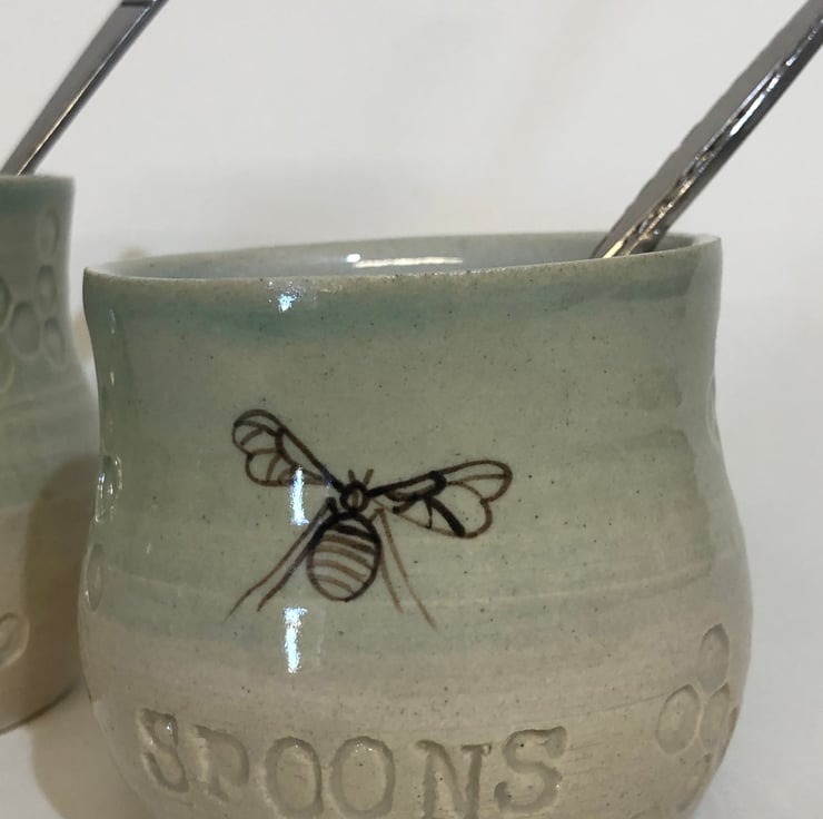 I first made these little tea spoon holders for a customer. They have been so popular with the hand painted bee and the comb texture. I use one at home, if like me you like a few cuppas through the day it saves having lots of spoons in the sink, so less washing up.