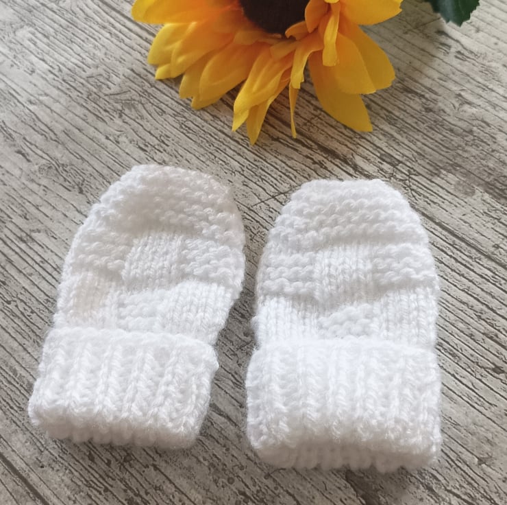 Hand knitted 0-3 months mittens. Made in 100% acrylic yarn in a lovely basket Weave pattern in white.