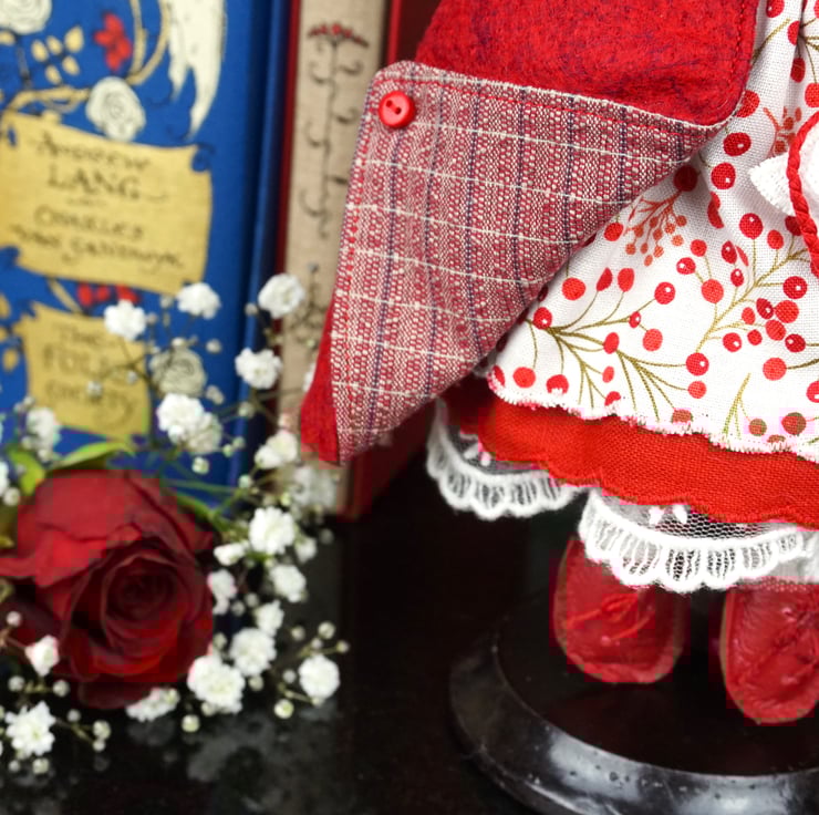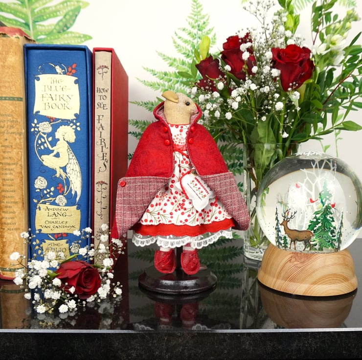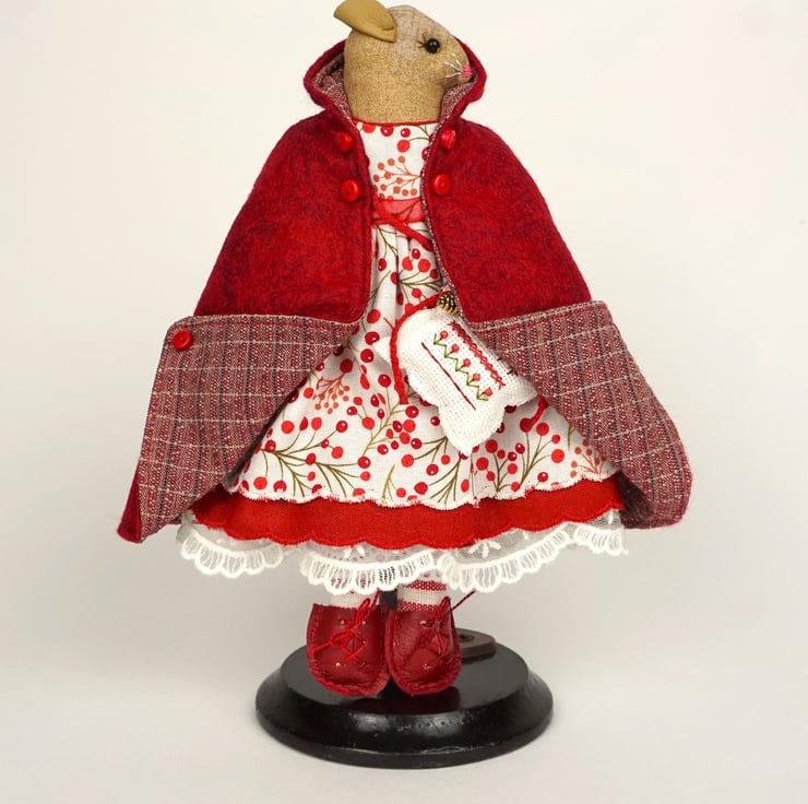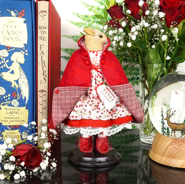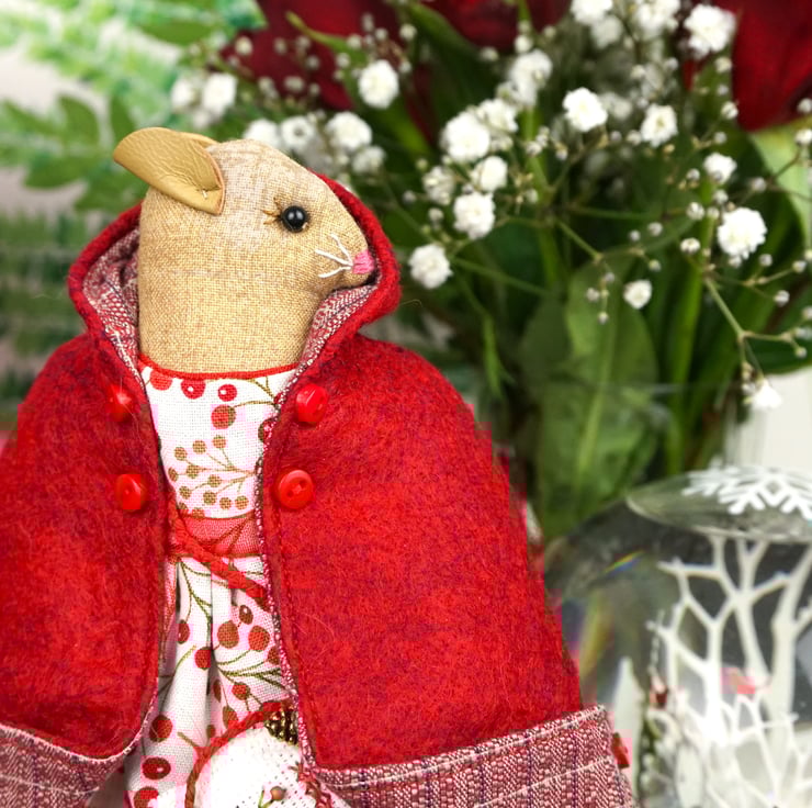 This is Juniper, a tiny winter berry Christmas mouse in a wool cape. She is a hand embroidered mouse with little leather ears and tail. She is dressed in a Winter Berry print, an ivory ground with berries in a range of reds with russet tones. She has coordinating underskirts in scarlet linen, white tulle mesh and white cotton lace bloomers. To keep warm she has a wool cape lines with a Japanese yarn dye cotton. Her dress is finished with organza ribbon, tiny buttons and little leather shoes. She is a brown mouse with brown ears, a pink tail with white whiskers and a pink nose with little black bead eyes.