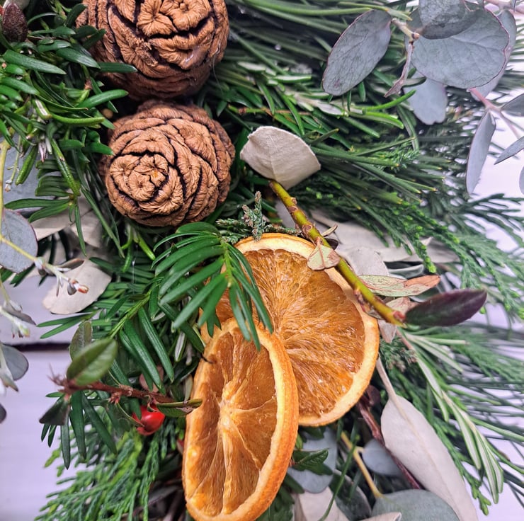 What sets our wreaths apart is the heart of them - the lush, British-grown foliage. We meticulously handpick holly, red cedar, pine, and other seasonal evergreens from Nettlebed Woodland and nearby local sources. The result is a wreath that is environmentally friendly and captures the essence of the season.