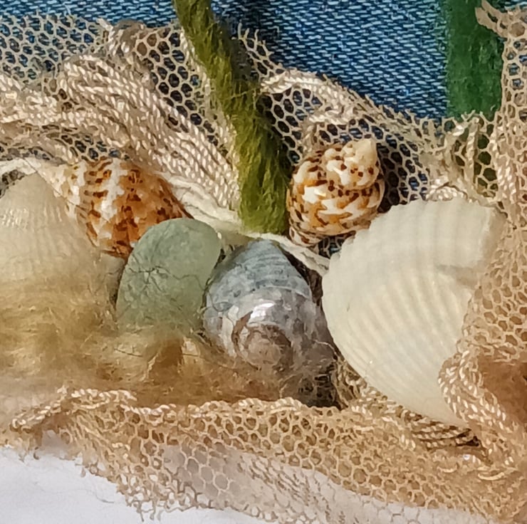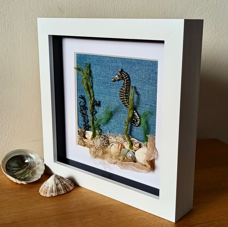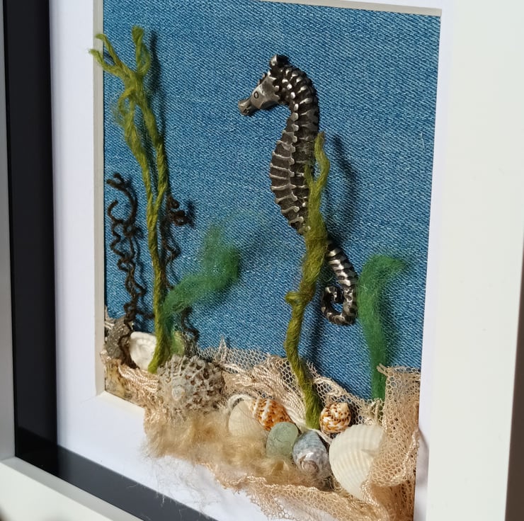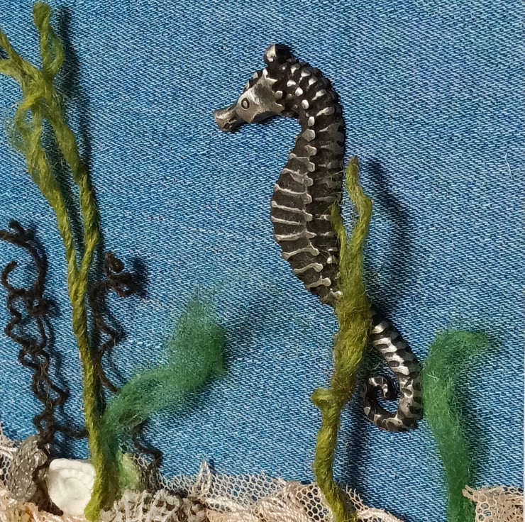 This beautiful seahorse was once a pendant, the chain had seen better days so I've repurposed it to swim in this underwater seascape. The sea is from a pair of old jeans, and seabed is made with lace and an array of small shells.