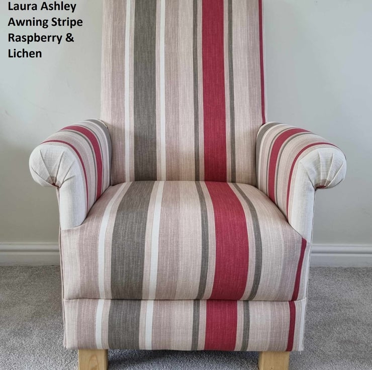 This is a fully assembled, handcrafted, sturdy ADULT'S chair, which has been made myself. I am a professional upholsterer with over 33 year’s experience, and have made this sturdy little chair using Laura Ashley Awning Stripe Raspberry & Lichen fabric.