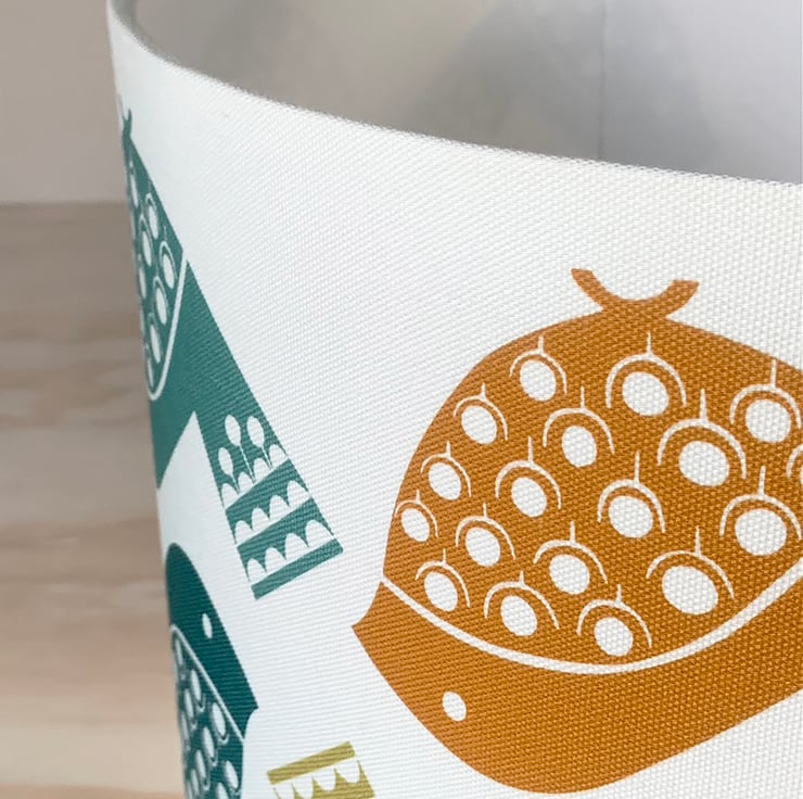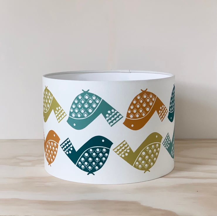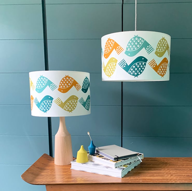 A vibrant Bird lampshade, inspired by woodland birds this design features an offset repeat pattern in olive yellow, orange, teal, and duck egg blue.