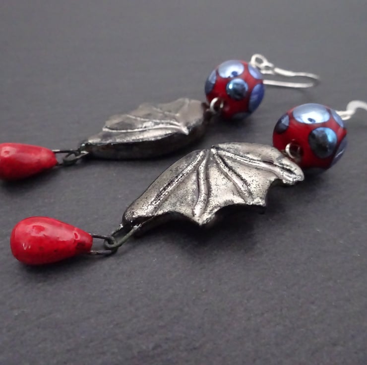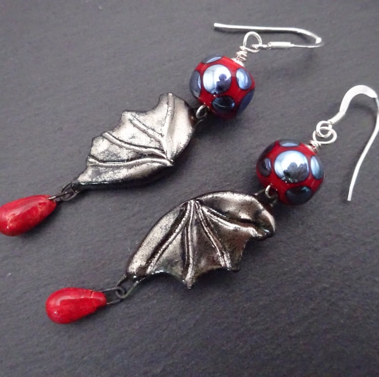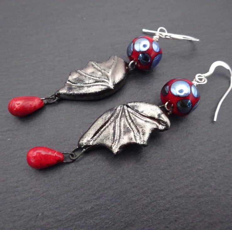 A pair of earrings made with sterling silver ear wires, handmade lampwork glass beads and handmade ceramic bat wings with a red drop.