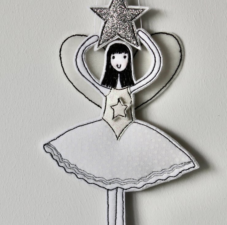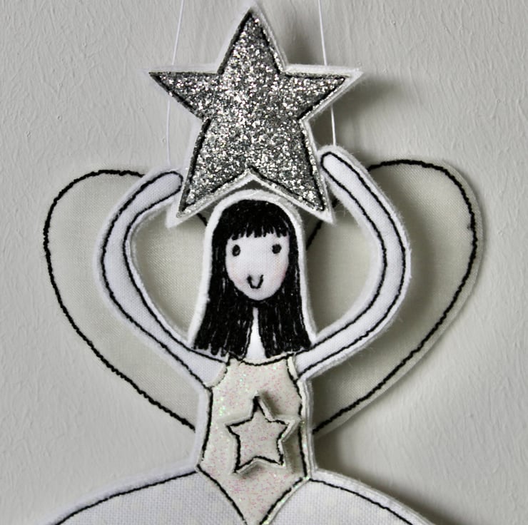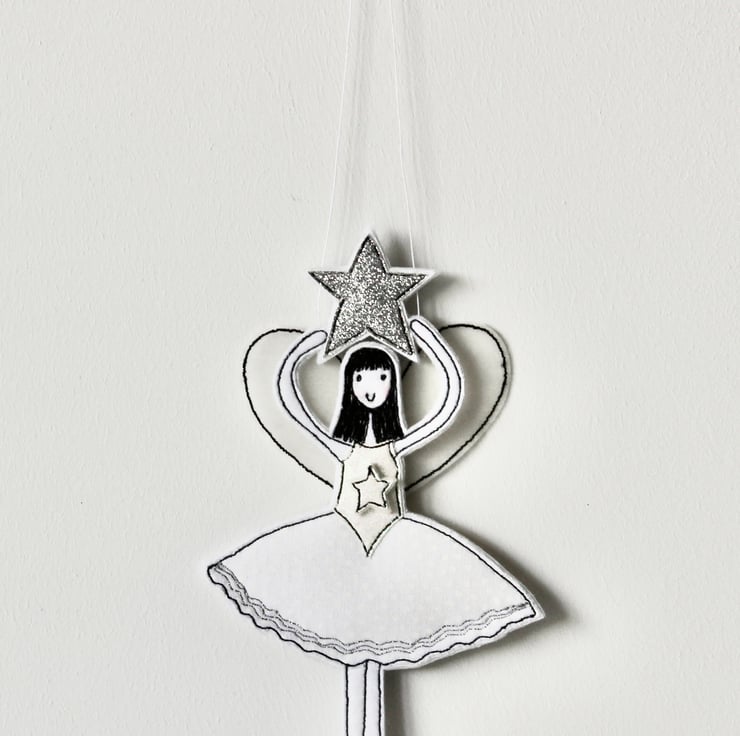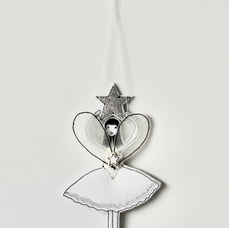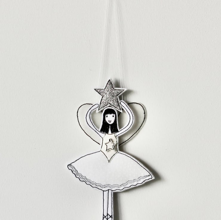 Each handmade fairy is sewn using silk organza, cotton cloth, glitter cloth, 100% wool felt and free hand machine embroidery; multiple layers of cloth are sewn together and cut out by hand using very sharp scissors. With a linen thread to hang.