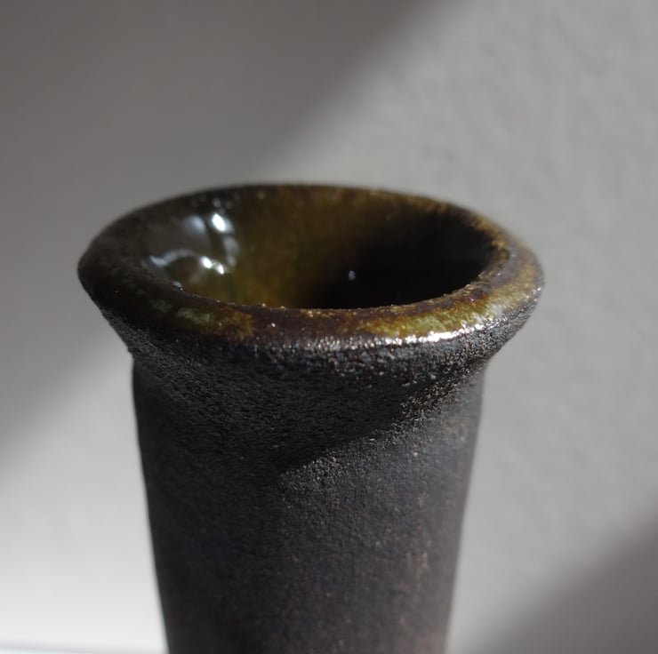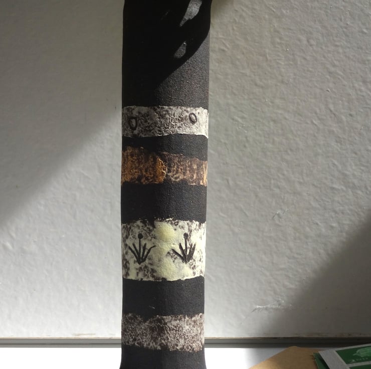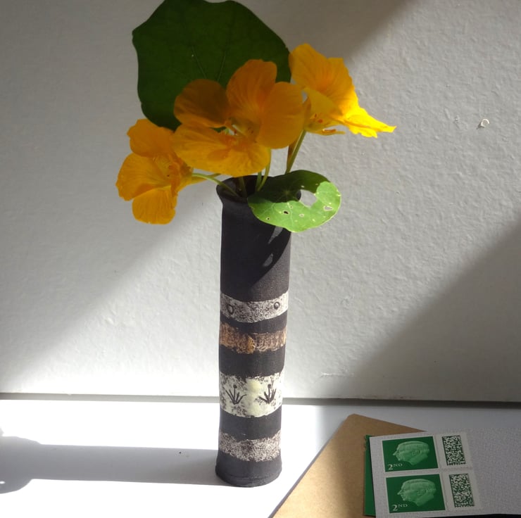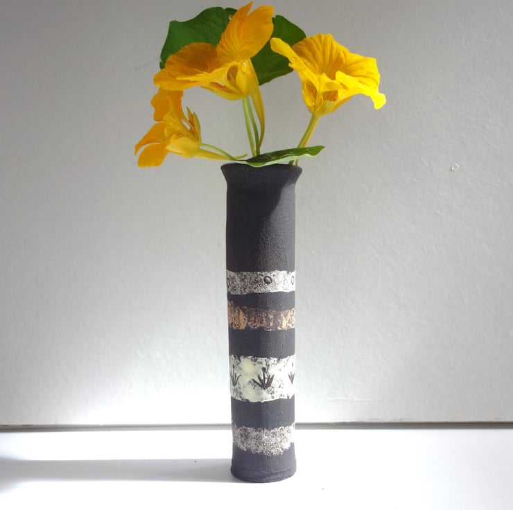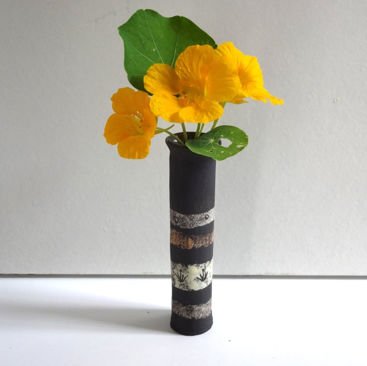 I handmade a ceramic bud vase that’s perfect for a single bloom or simple flower posy. On a black background of the natural stoneware clay, I created bands of colour, then incised simple nature inspired motifs to add to the design. The inside is glazed in a moss green gloss glaze so that it can hold water. It’s from my Lucienne range of art pottery ceramics, each one different and with its own character. Looks lovely on your breakfast table to add a special touch, or in your guest bedroom to welcome a visitor. A one-off in its form and decoration, and signed on the base with my potter’s mark of a swallow in flight. 13cm high and 3cm across the base.