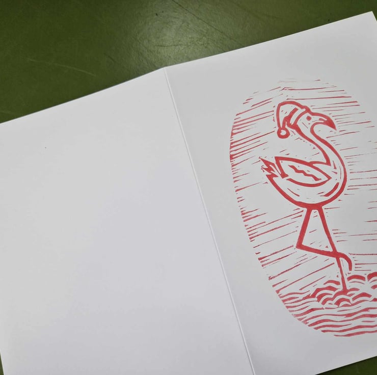 Printed with pink ink, this Santa hat wearing flamingo is available as a 7x5" card with envelope.