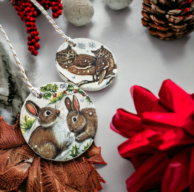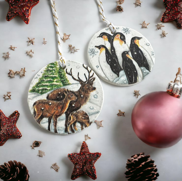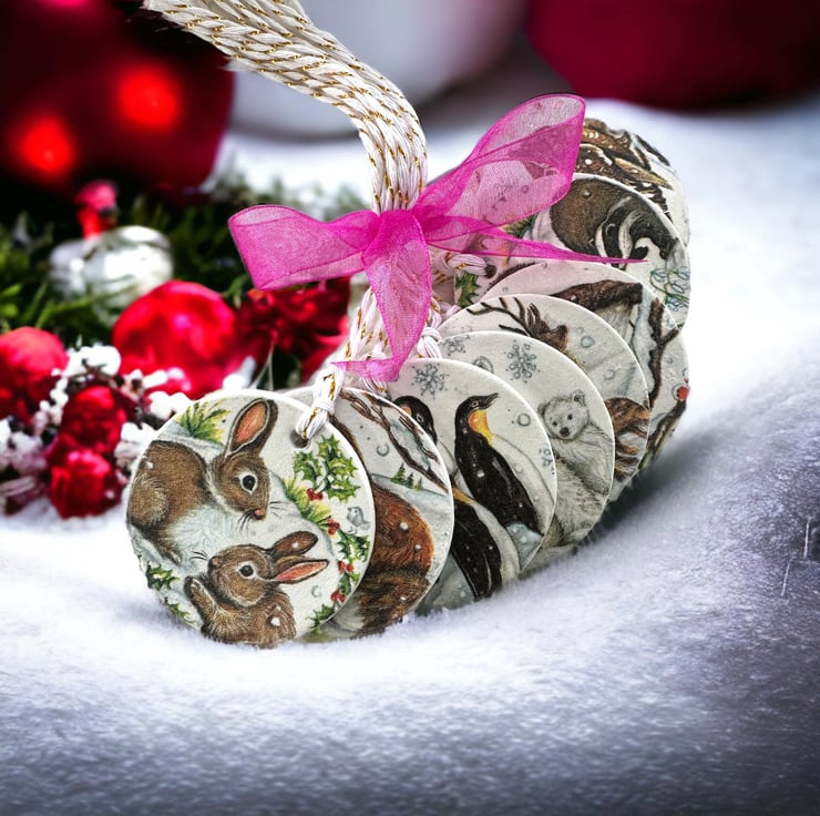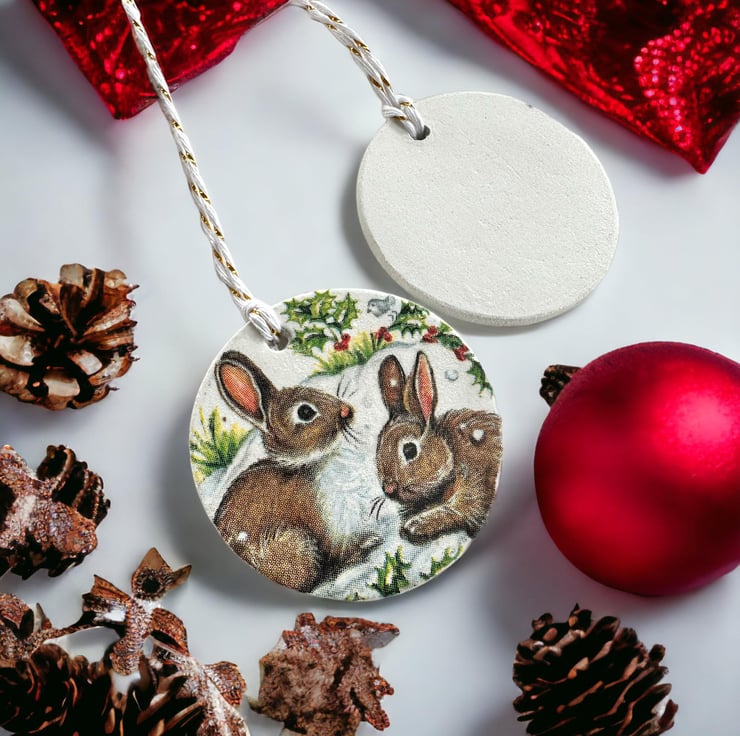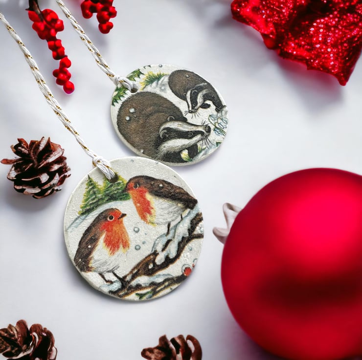 The flat shaped bauble is handmade with plaster of paris prior to the images applied using the art of Decoupage. The reverse of the bauble is left blank so you could write a message using pen, pencil or paints. Gold Twine is added making these ready to hang. Alternatively you could use as luxury gift tags for those special presents.