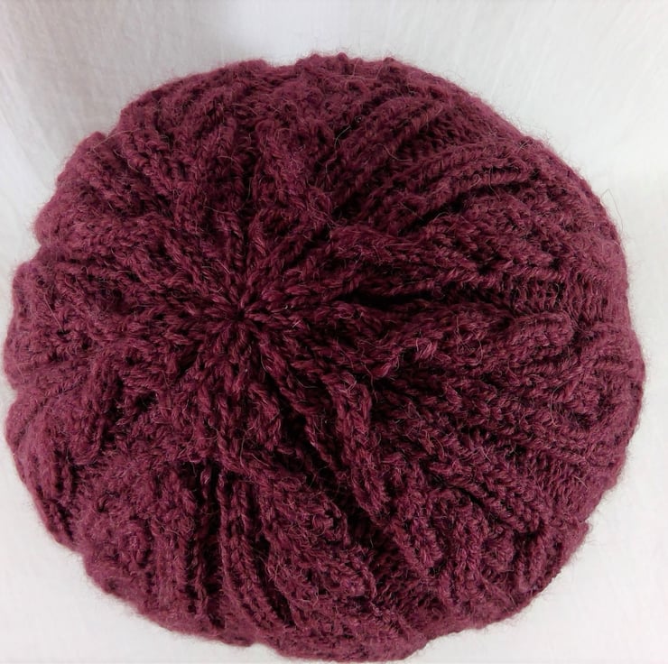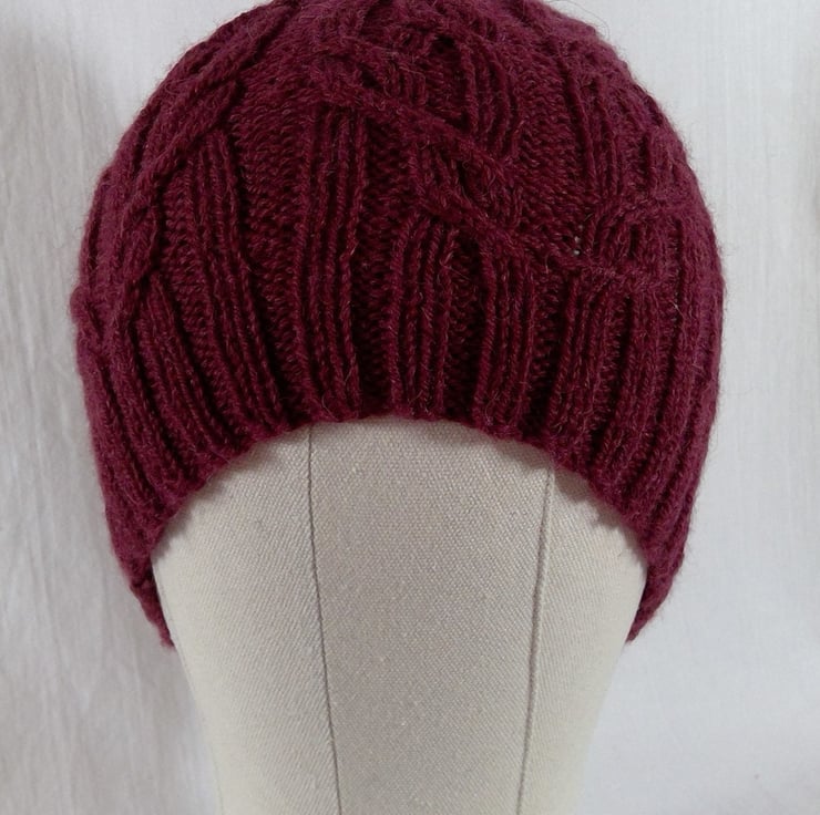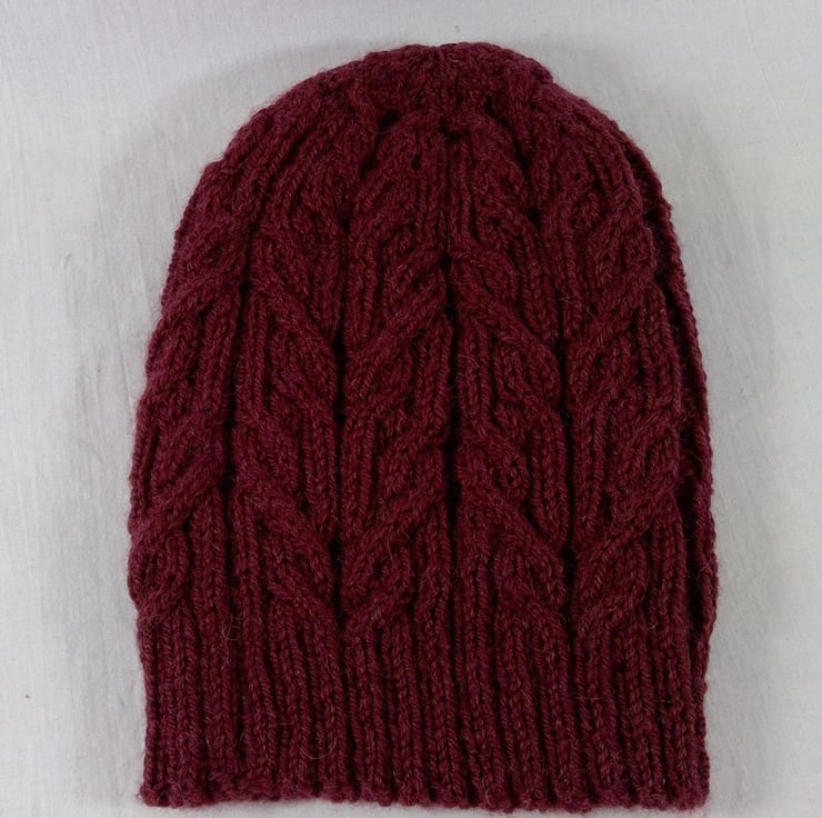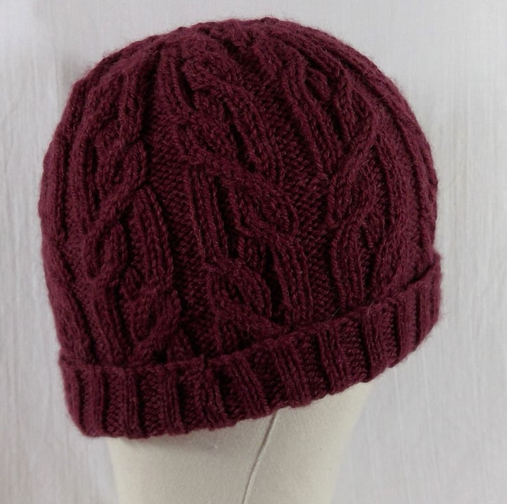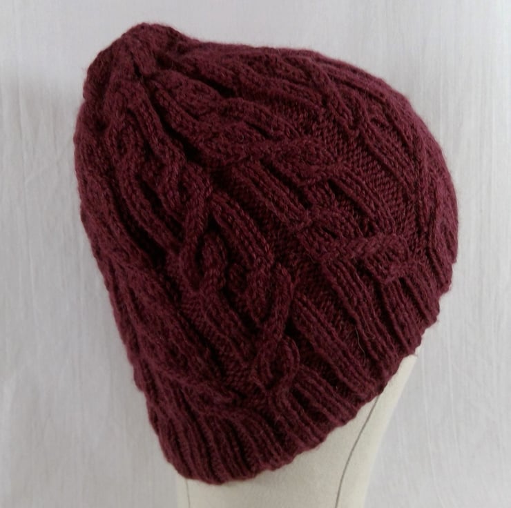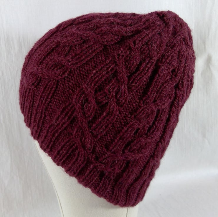 A hand knitted intricately cabled hat. The yarn is a beautiful luxurious and warm mix of 72% wool,25% alpaca and 3% silk in a deep burgundywine shade. The cable pattern spans the entire perimeter and runs up the side of the hat, and is incorporated in the shaping at the top. With the brim up this is more fitted, but this hat can be worn brim down for a more slouchier appearance.