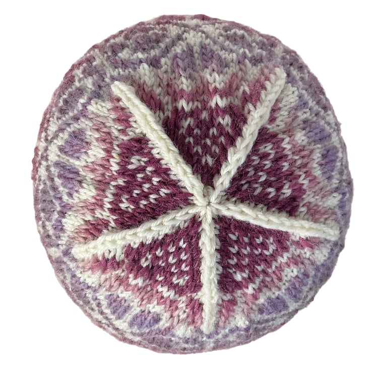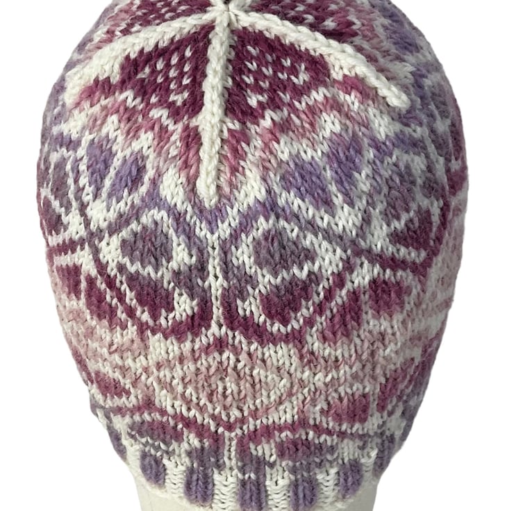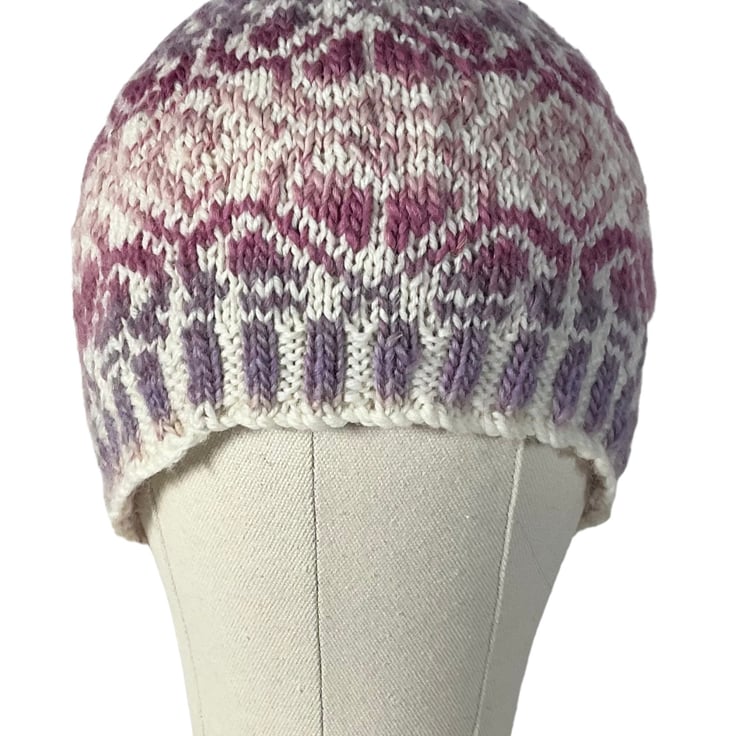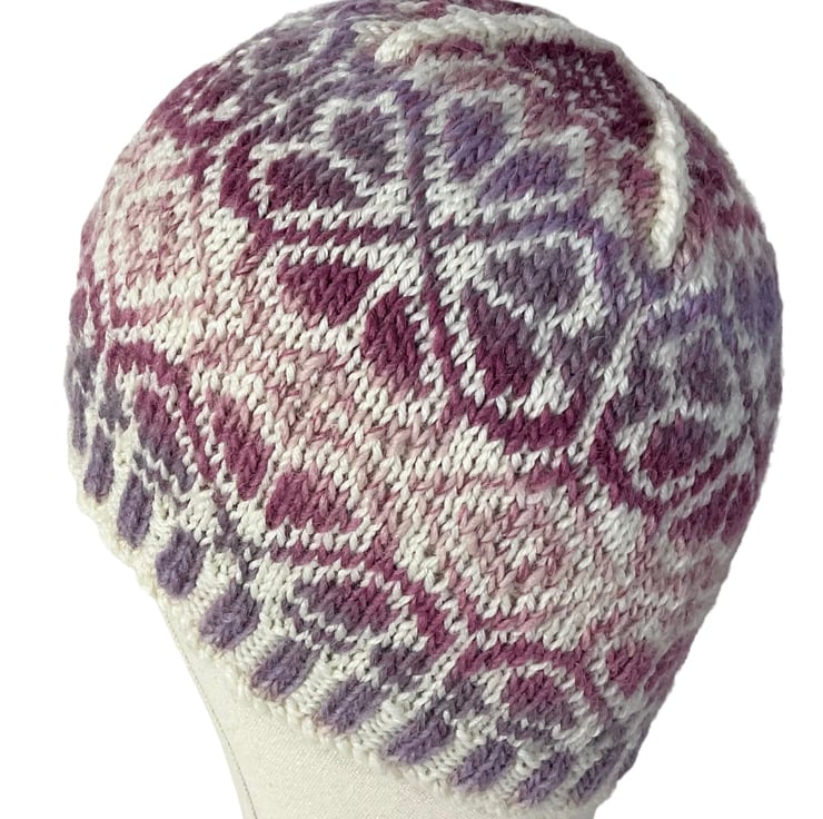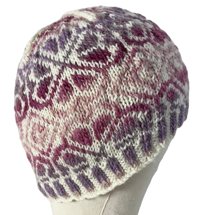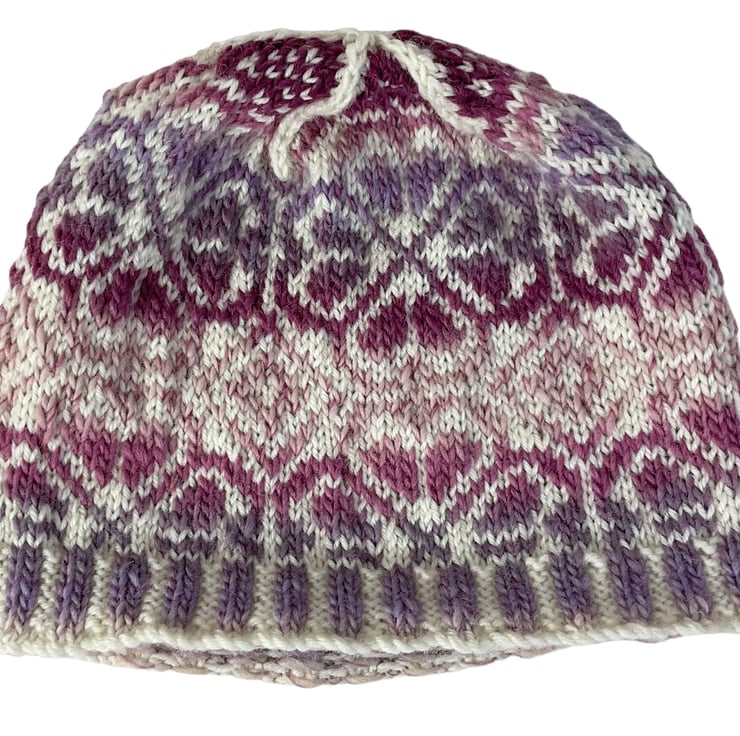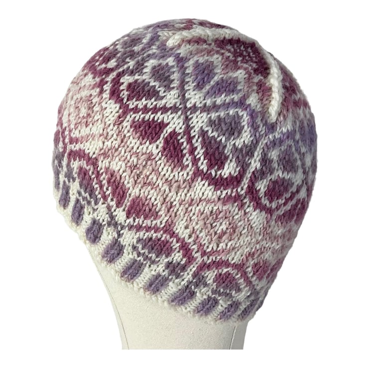 A hand knitted very pretty hat. The yarn is a a soft 100% wool. This yarn is a heavier weight than my usual stranded hats, so nice and warm! The main yarn is a very pretty variegated mid lilac purple and transitioning into a variety of pinks from pale to cerise.