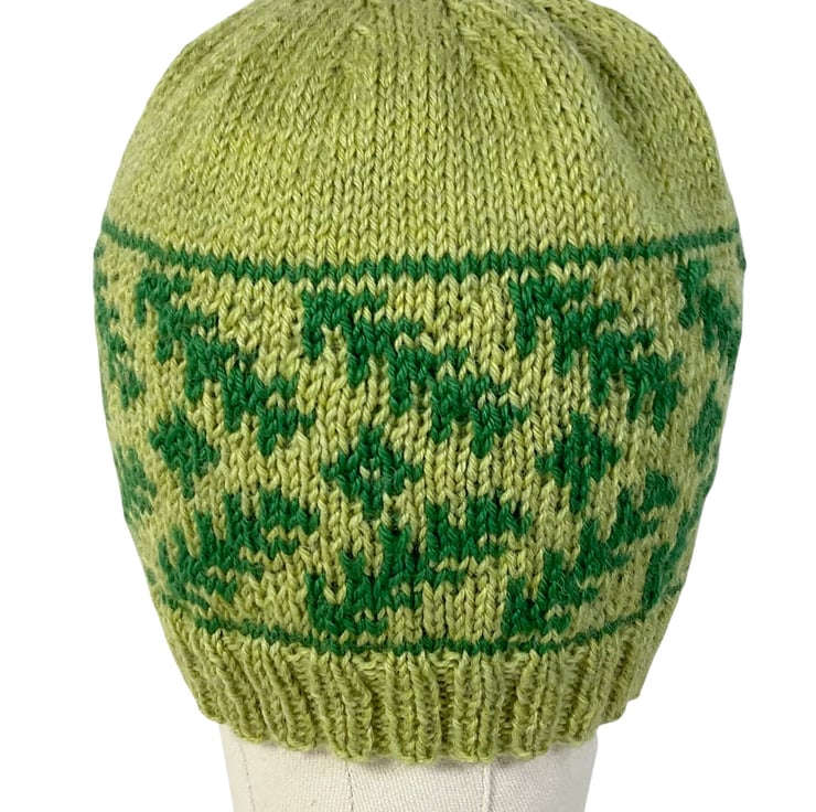 This pretty hat is made from a pure wool yarn. it has an attractive fern leaf pattern around the circumference of the hat. The main colour is a pale pea pod green shade and The contrast is a Grass green colour.