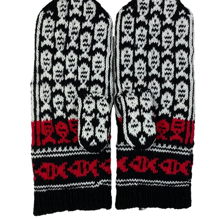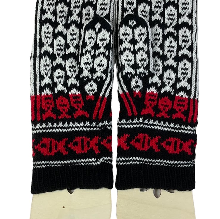 These beautiful gloves are in 100% pure merino wool, so perfect cold weather wear. Any cat lover would love these with their cute cat faces on a black base. The realistic faces fill the whole of the back of each hand and the eyes are highlighted in royal blue. The main background colour is black with the cat in cream. The rib is in black and above this is a band of red fish, blending into white. The pattern continues above the cats again in the white. The stranding continues on the palm of the hands and thumbs, which have a pattern of fish in the white.
