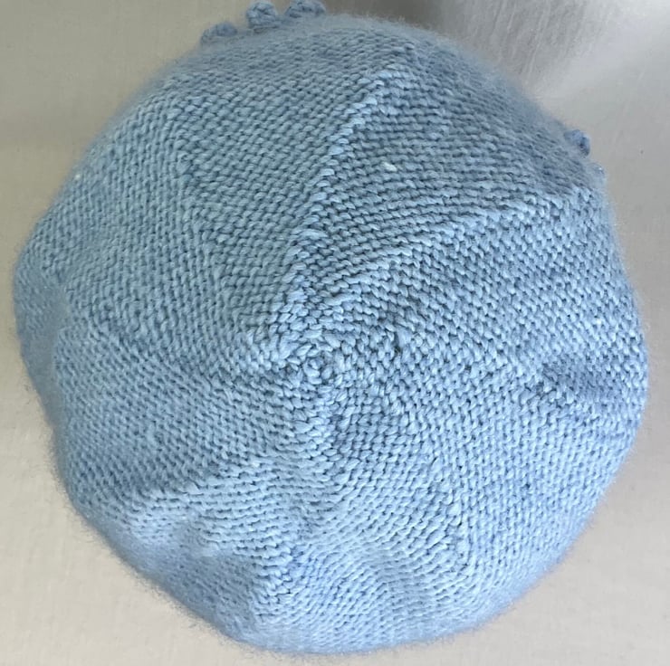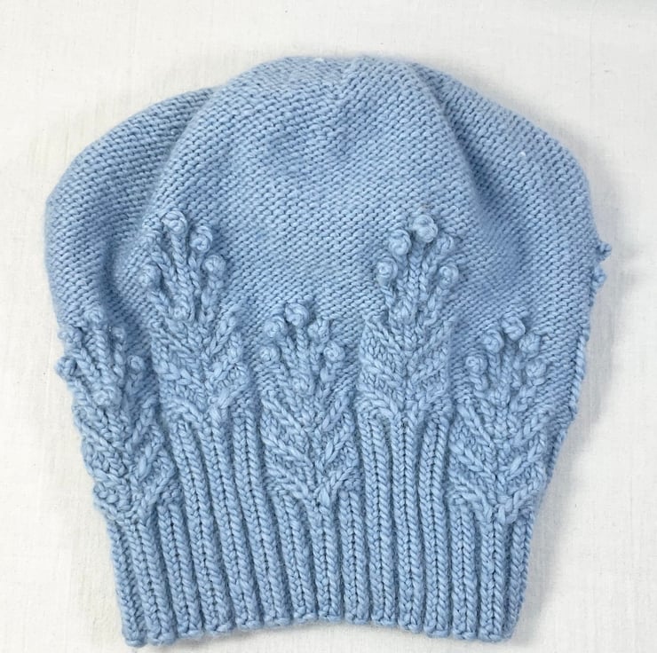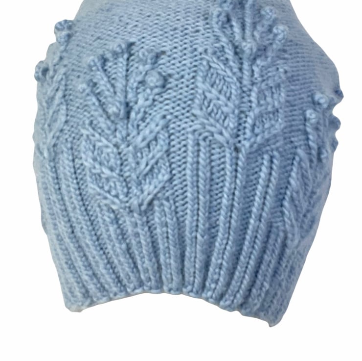 What a beautiful pattern on this hat, cables and bobbles and in the softest 100% pure organic merino wool in a soft pale blue shade. The rib at the base cleverly adapts into the main pattern of stems of flowers, which then converts to reversed stocking stitch above and for the decreases.
