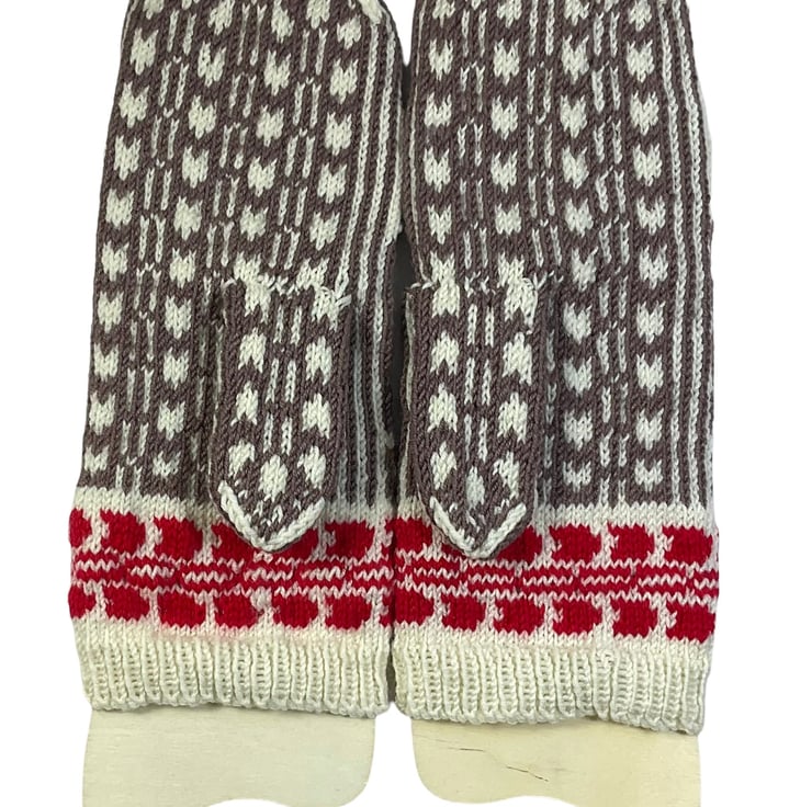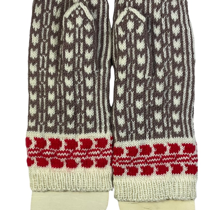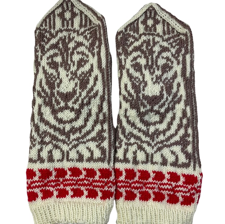 A very realistic lioness knitted in chocolate brown on a cream background is the centrepiece of the back off each hand. The stranding continues on the palm and the thumbs with an attractive arrow head pattern. Below the lioness is a pattern in bright red that really makes the mittens pop.