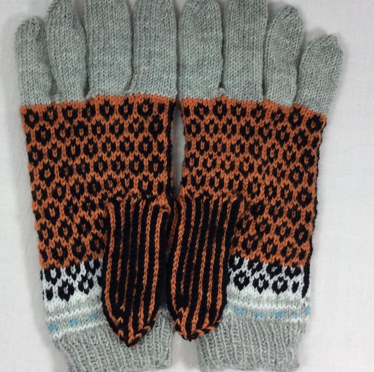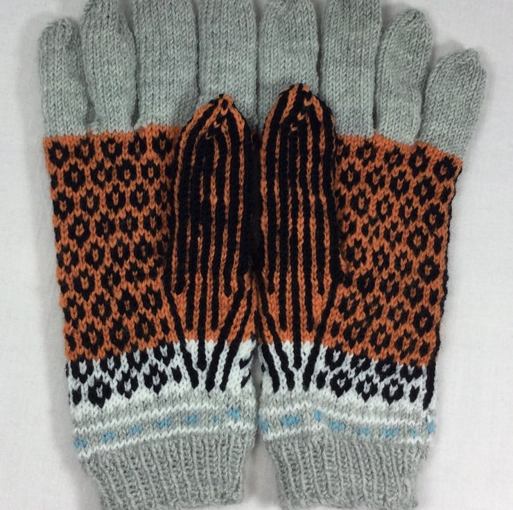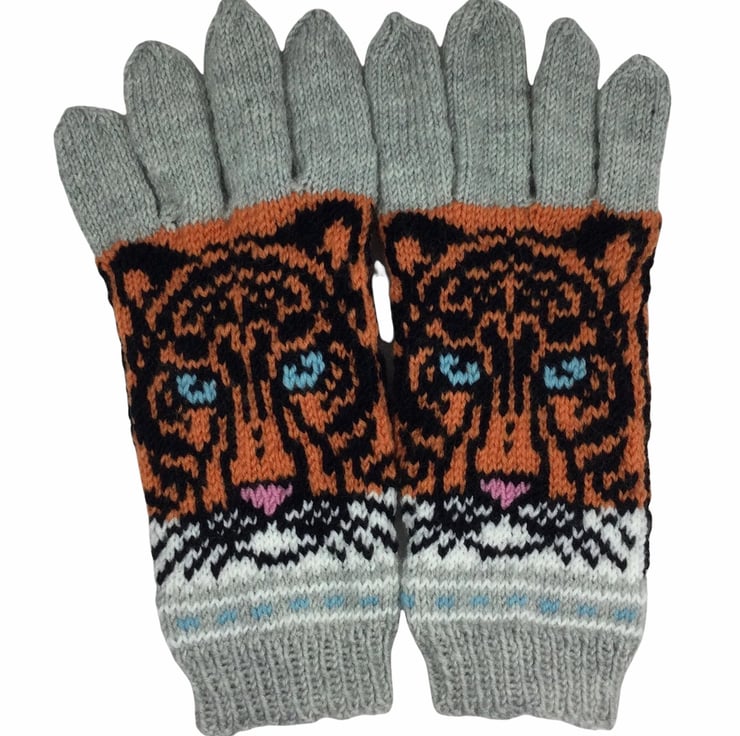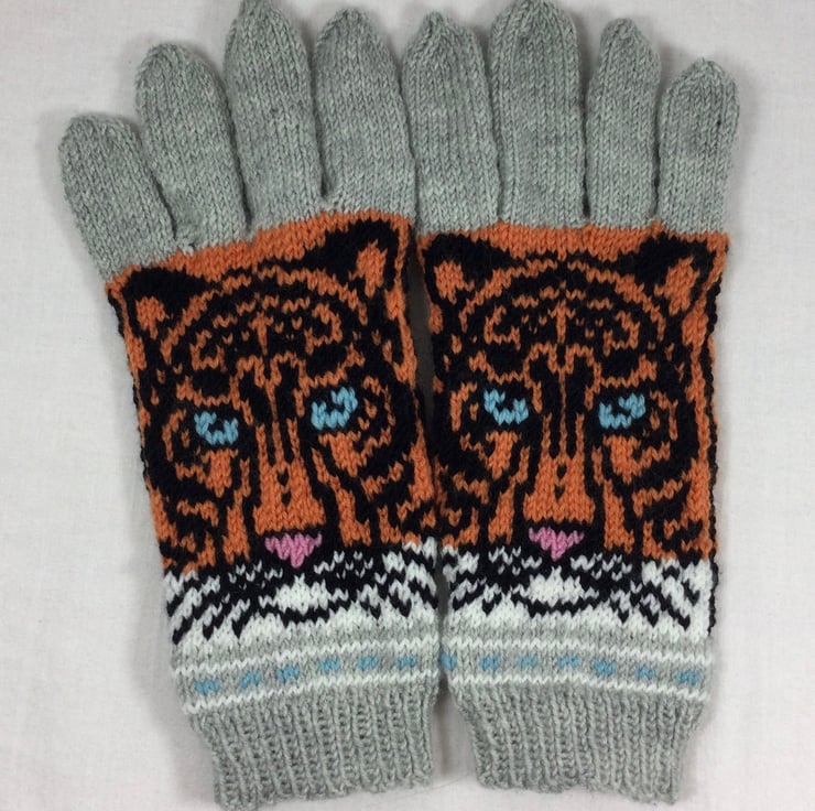 These beautiful gloves are in pure 100% wool, so perfect cold weather wear. The design on these gloves shows a Realistic tiger face on each back of hand, along with a row of fair isle patterning at wrist level I have used a variety of pretty shades, a silver grey shade for the Rib, some of the fair isle and the fingers, white above this changing into orange as a background for the black tiger. The eyes and nose are Swiss darned in blue and pink respectively.