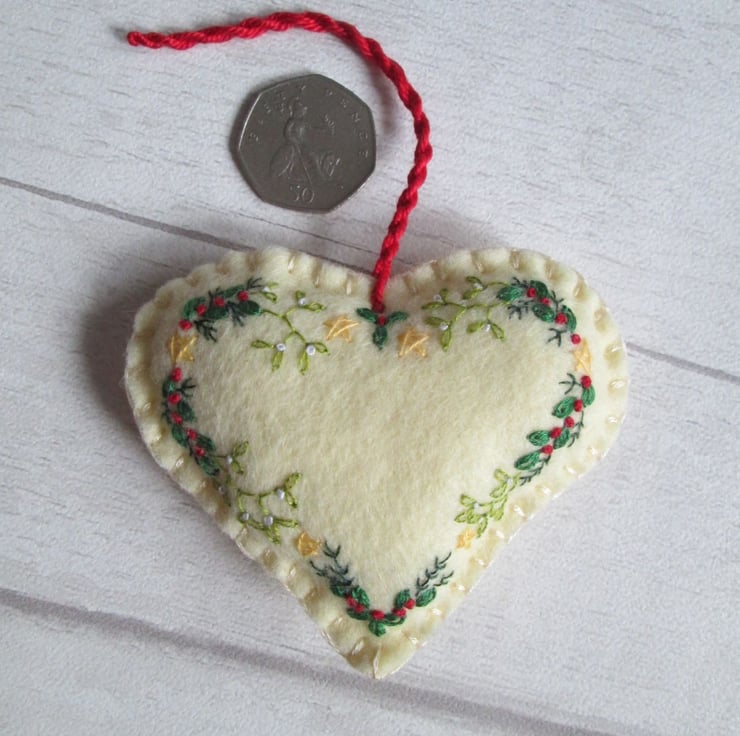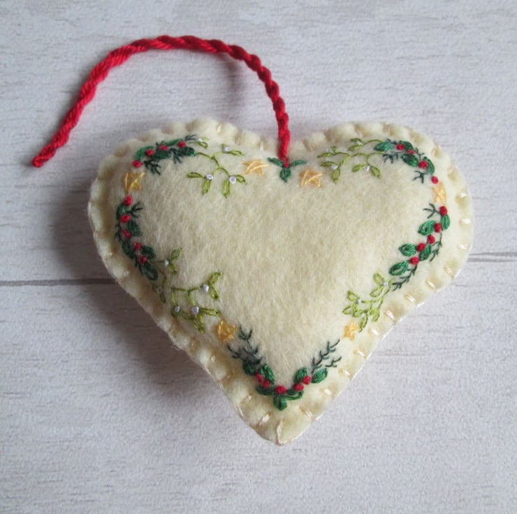 A rather special festive decoration - a cream wool felt heart, carefully hand embroidered with a wreath of holly, mistletoe, fir and stars. The little heart has been lightly stuffed, and finished with cream blanket stitch and a twisted embroidery thread hanging loop. It measures approximately 9 cm wide by 8 cm high (not including hanging loop) and would make a wonderful addition to a traditional tree.
