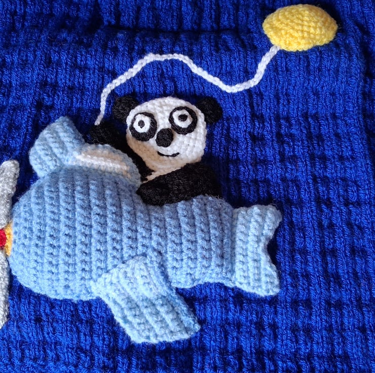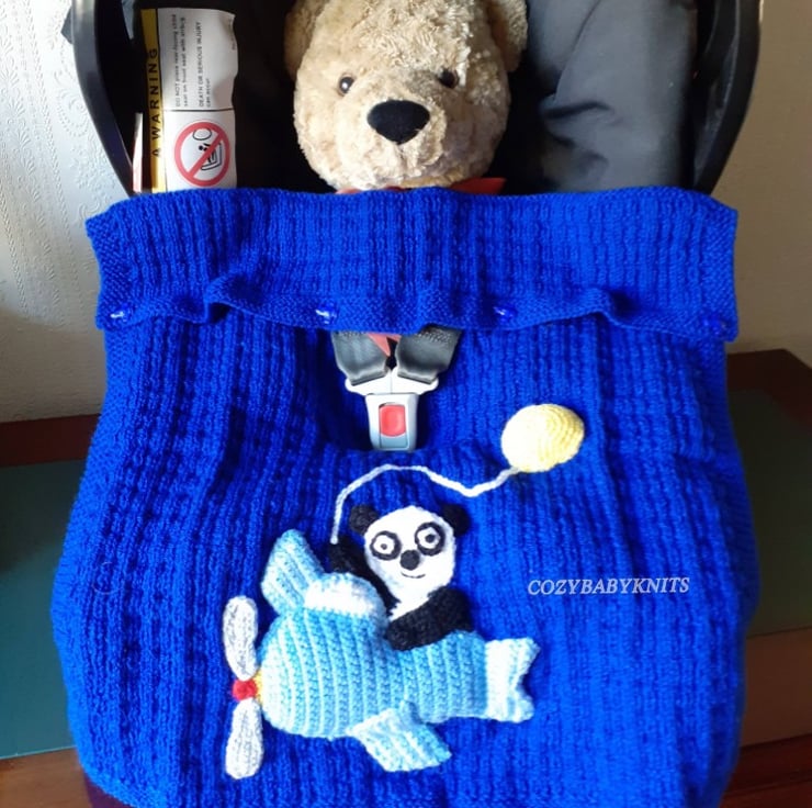 Royal blue baby car seat blanket with a panda in a plane holding a balloon appliqued on to the blanket.