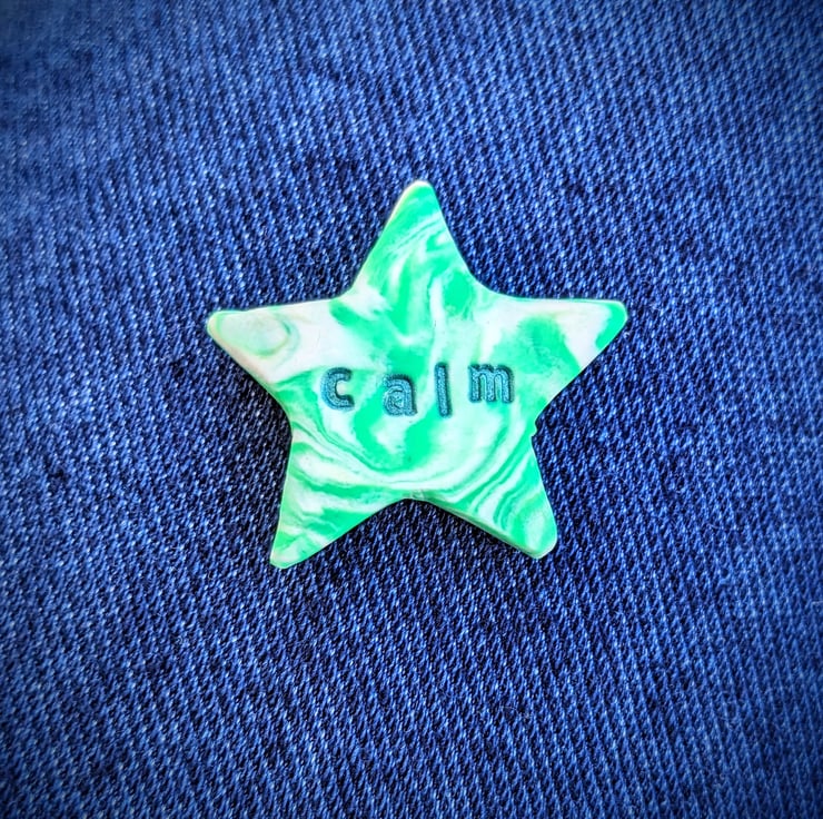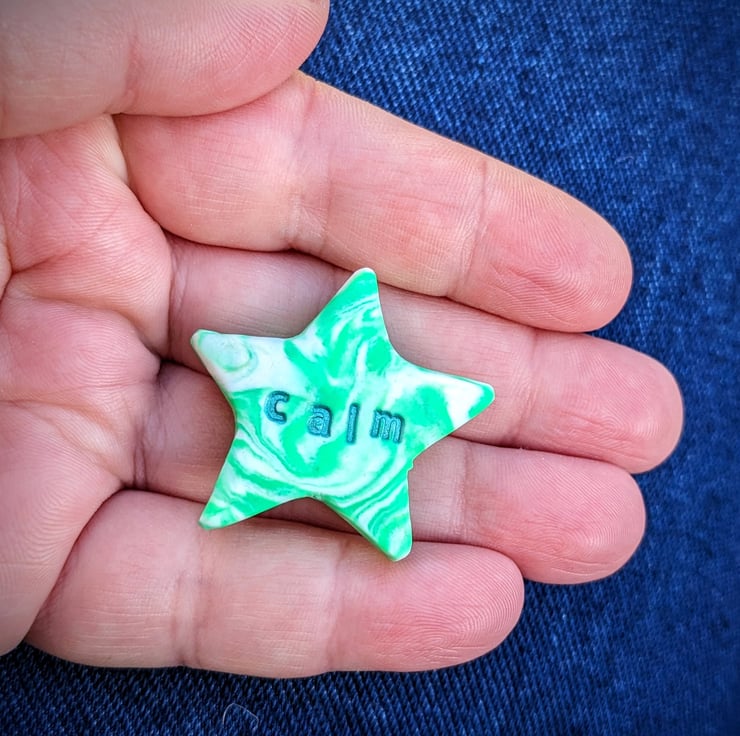 This beautiful star is stamped with the word 'calm' as a little pocket-sized reminder to keep your cool and just breathe. The green and white swirls just add to the sense of peace.